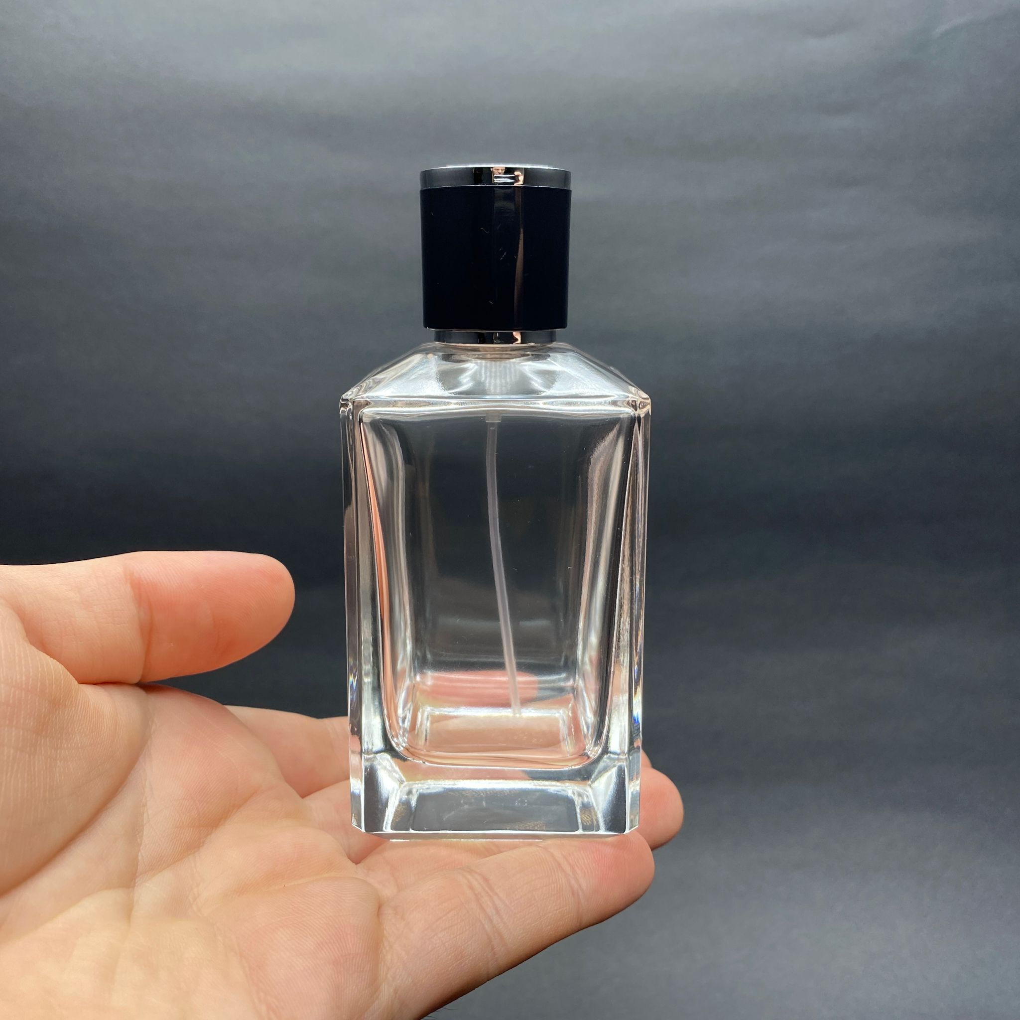 100 ML KÖŞELİ KONİK MODEL PRİZMA PARFÜM ŞİŞESİ - GOLD METAL SPREYLİ + GÜMÜŞ SİYAH KAPAKLI (AĞIZ 15 MM GEÇME KOLAY KAPAMA) - 70 adet