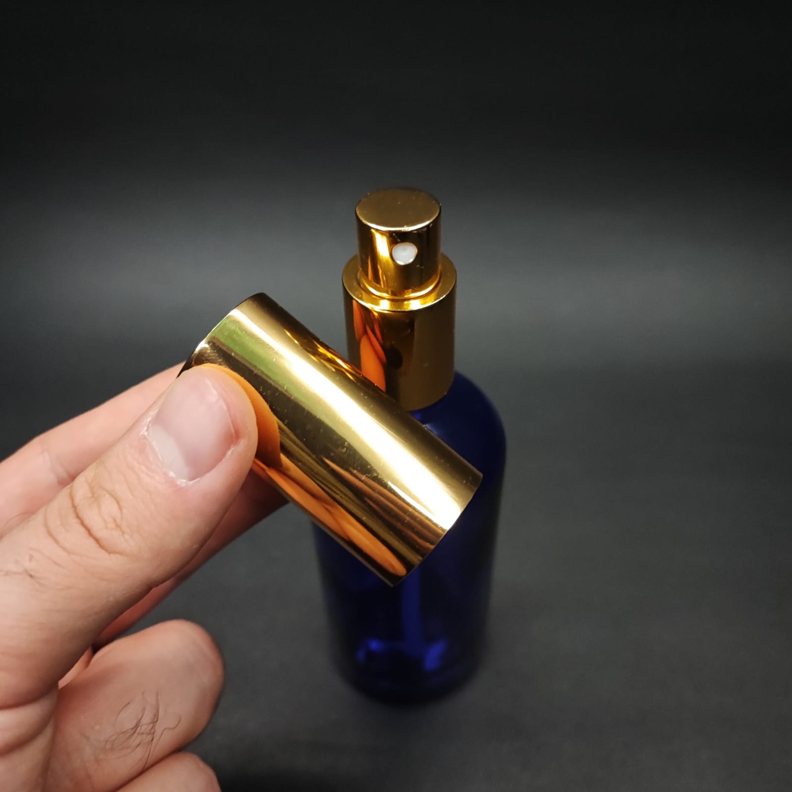 100 ML LÜKS VİDALI VALF ÇEVİRME PARFÜM ŞİŞELERİ - 100 CC MAVİ CAM ŞİŞE - GOLD METAL SPREYLİ KAPAKLI SET - 70 adet