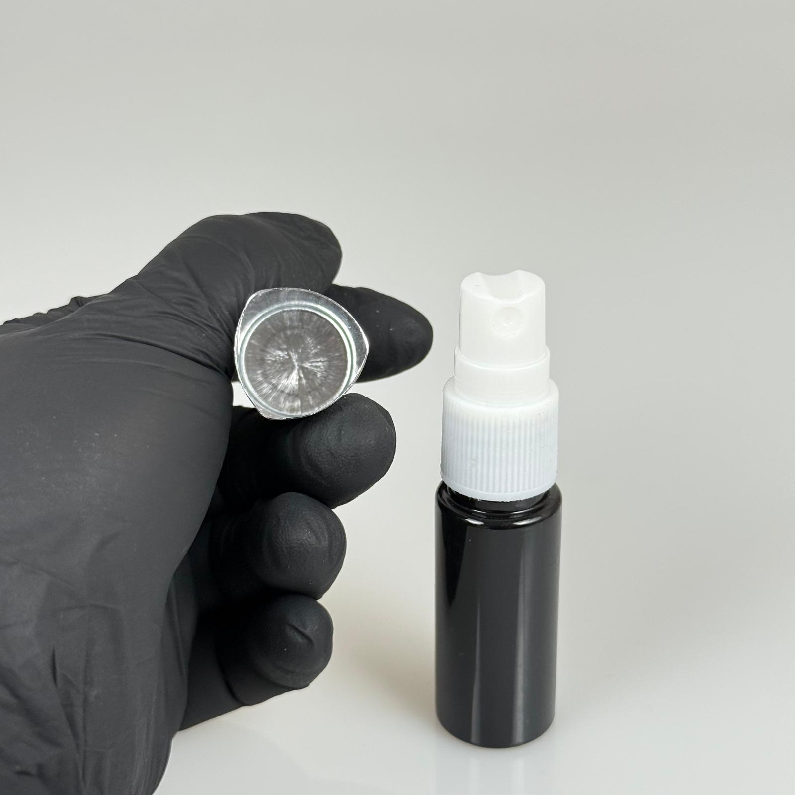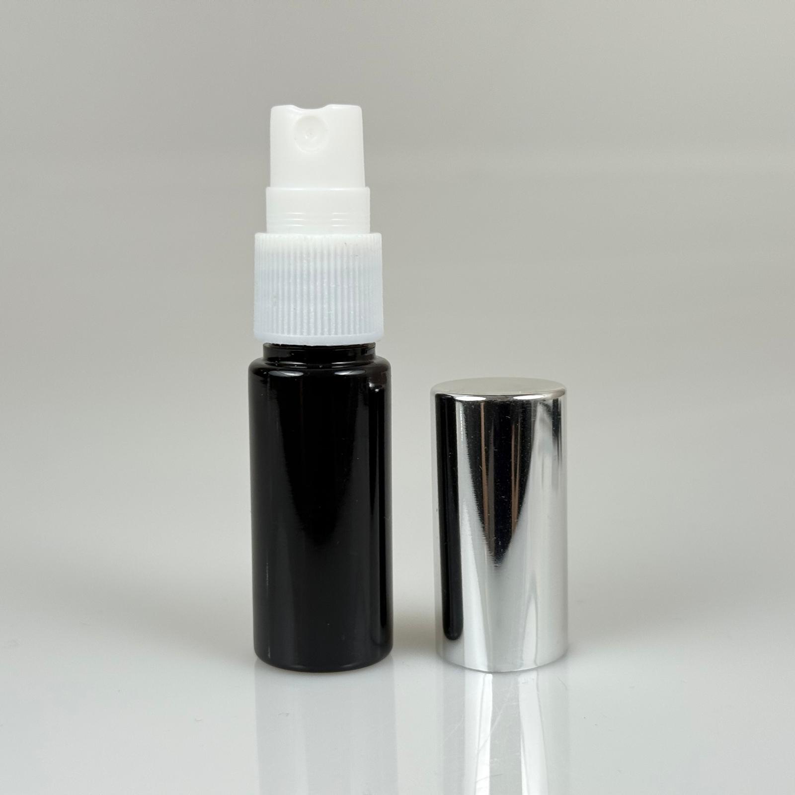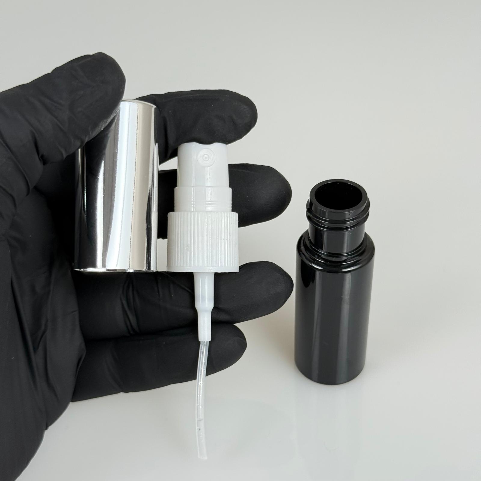 15 ML PET KOLONYA, PARFÜM VB ŞİŞELERİ - METAL ALÜMİNYUM GÜMÜŞ KAPAK + VİDALI SPREY + 15 CC SİYAH ŞİŞE SET TAKIM - 1000 adet
