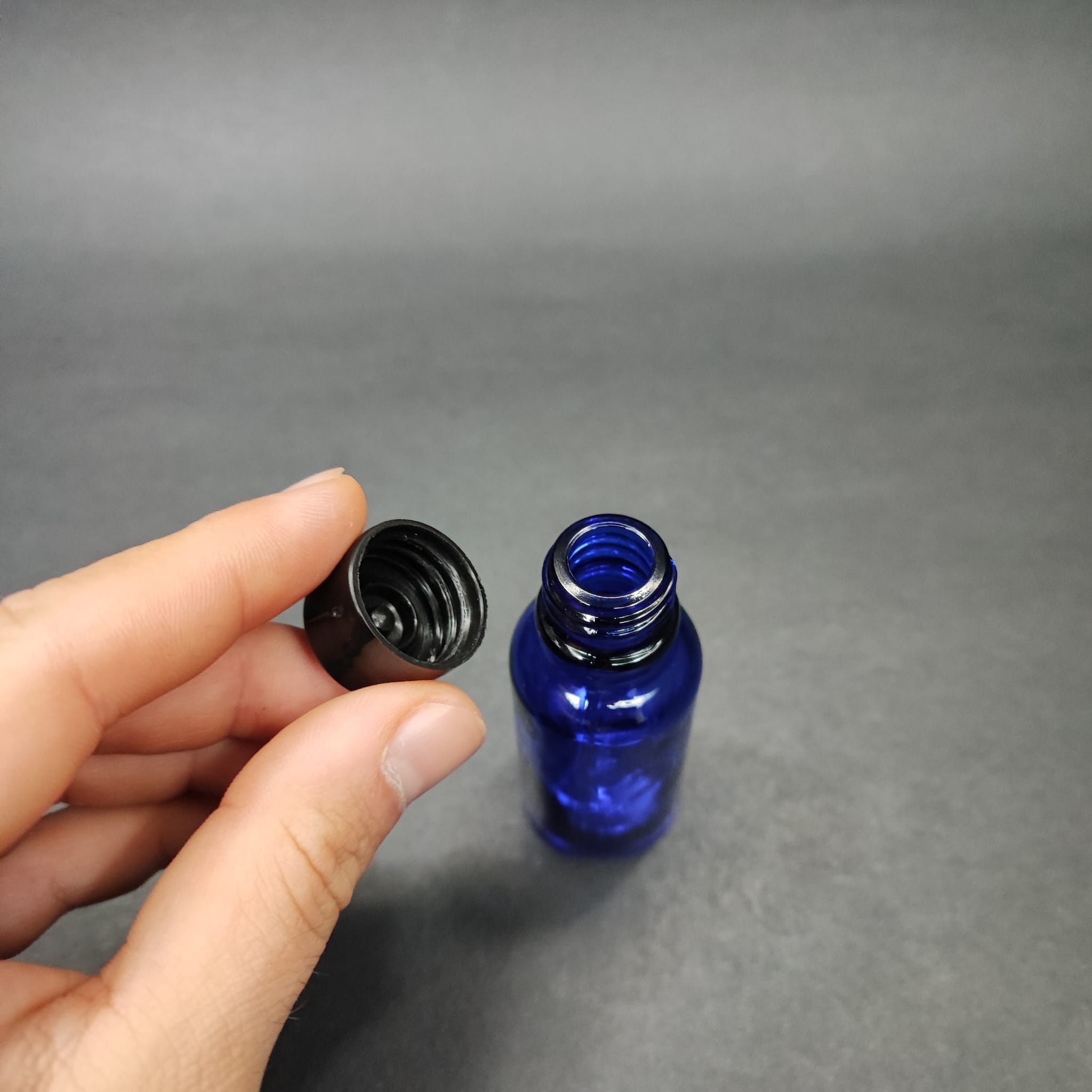20 CC MAVİ CAM ŞİŞE + KENDİNDEN CONTALI SIZDIRMAZ SİYAH KAPAK - 20 ML KAPAKLI CAM ŞİŞE - 156 adet