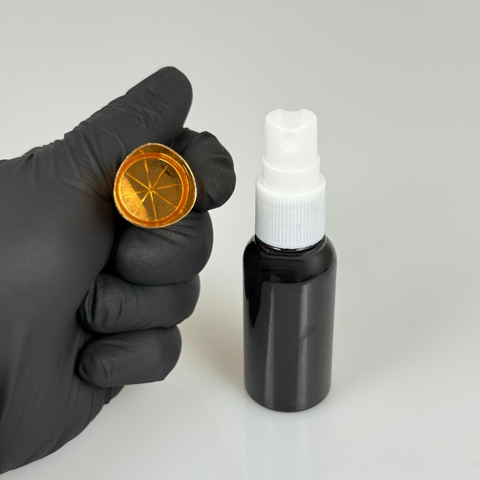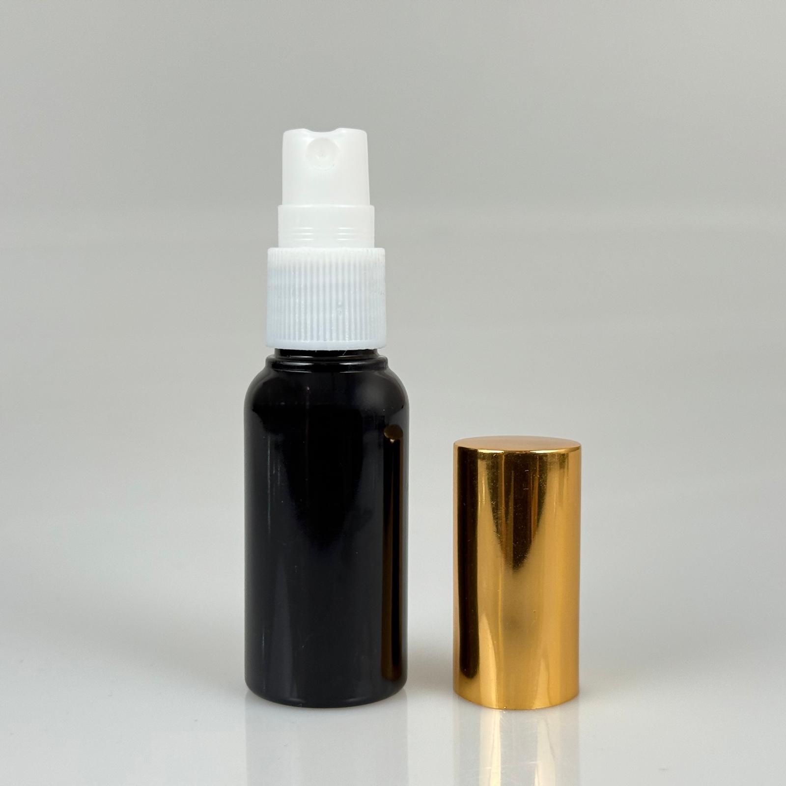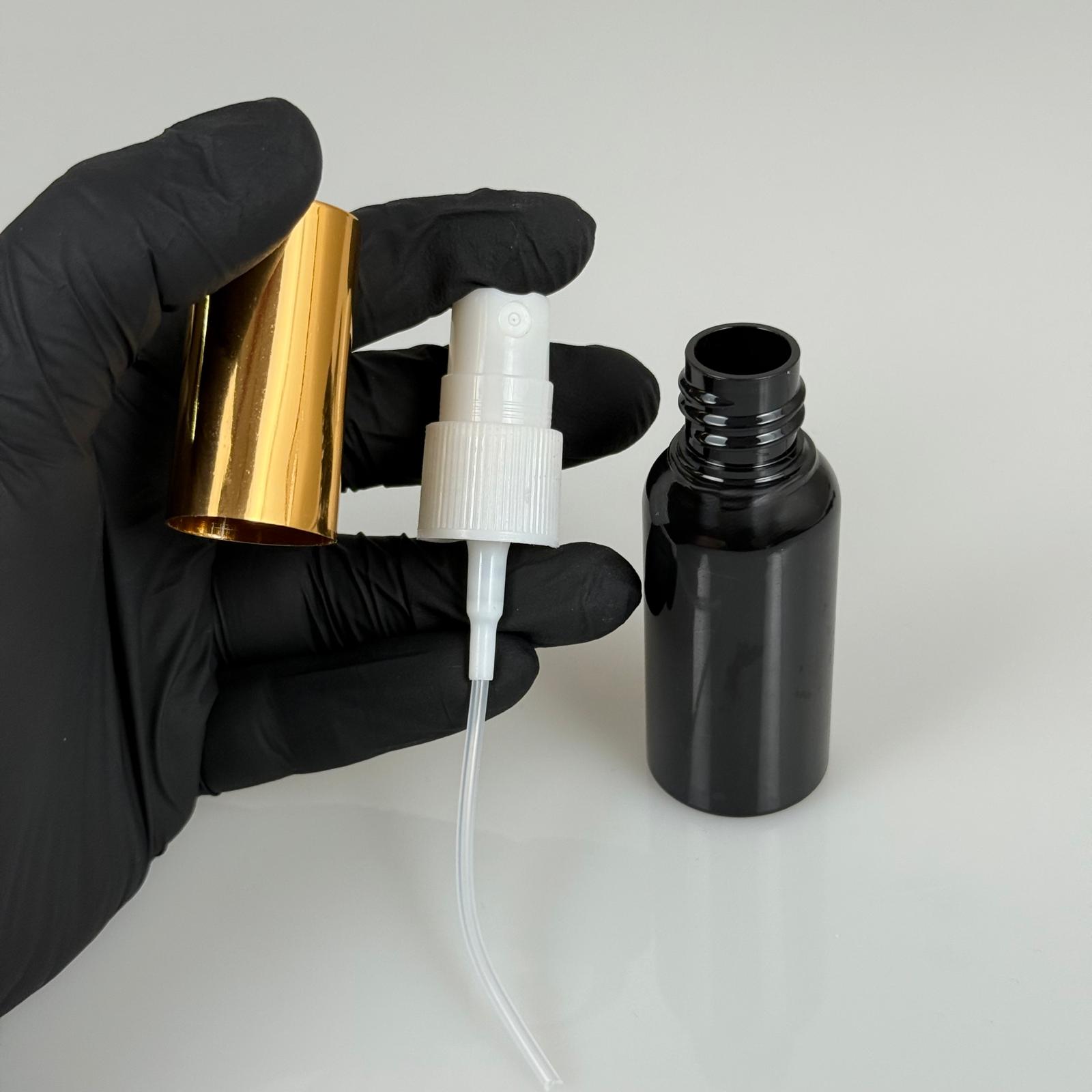 30 ML PET KOLONYA, PARFÜM VB ŞİŞELERİ - METAL ALÜMİNYUM GOLD KAPAK + VİDALI SPREY + 30 CC SİYAH ŞİŞE SET TAKIM - 1000 adet