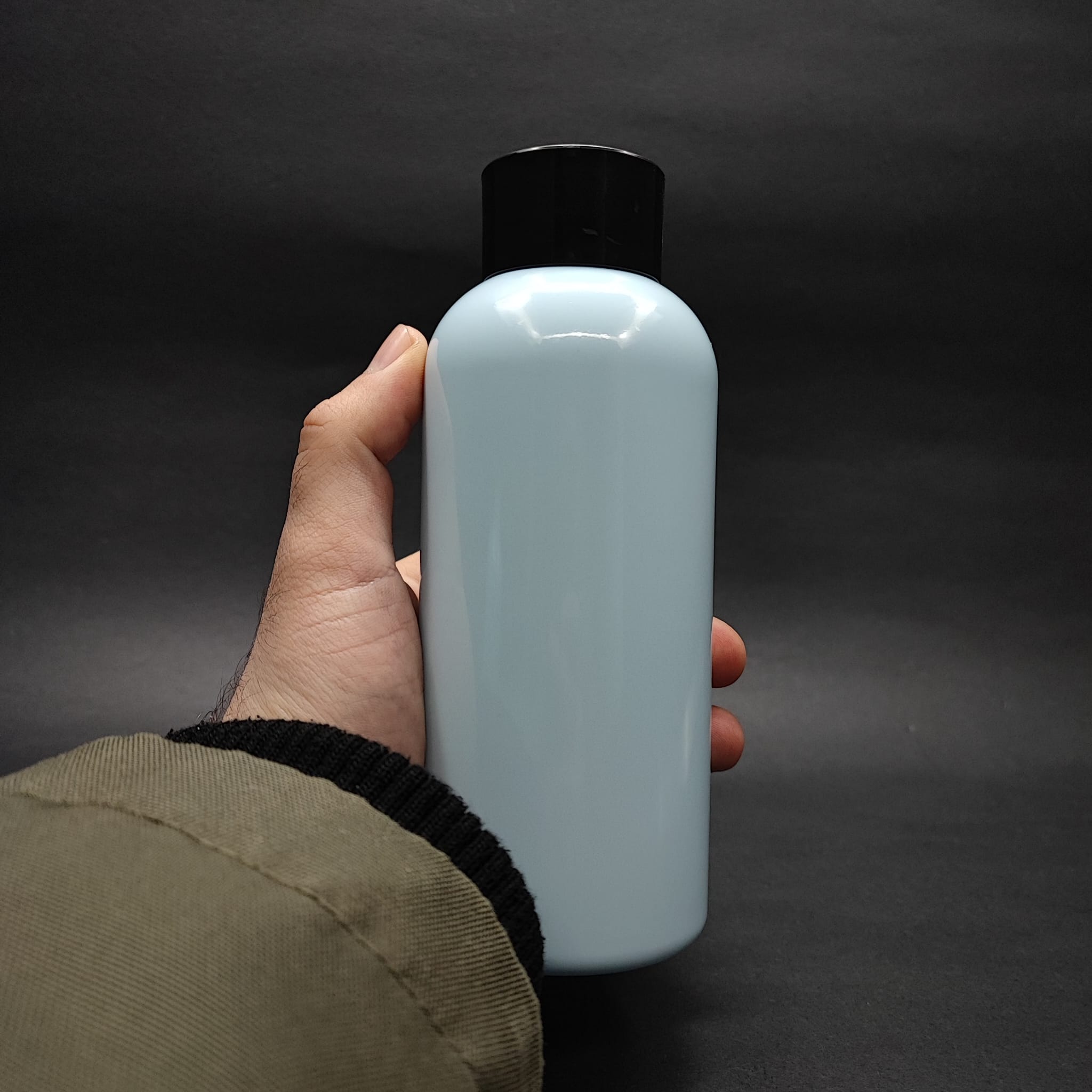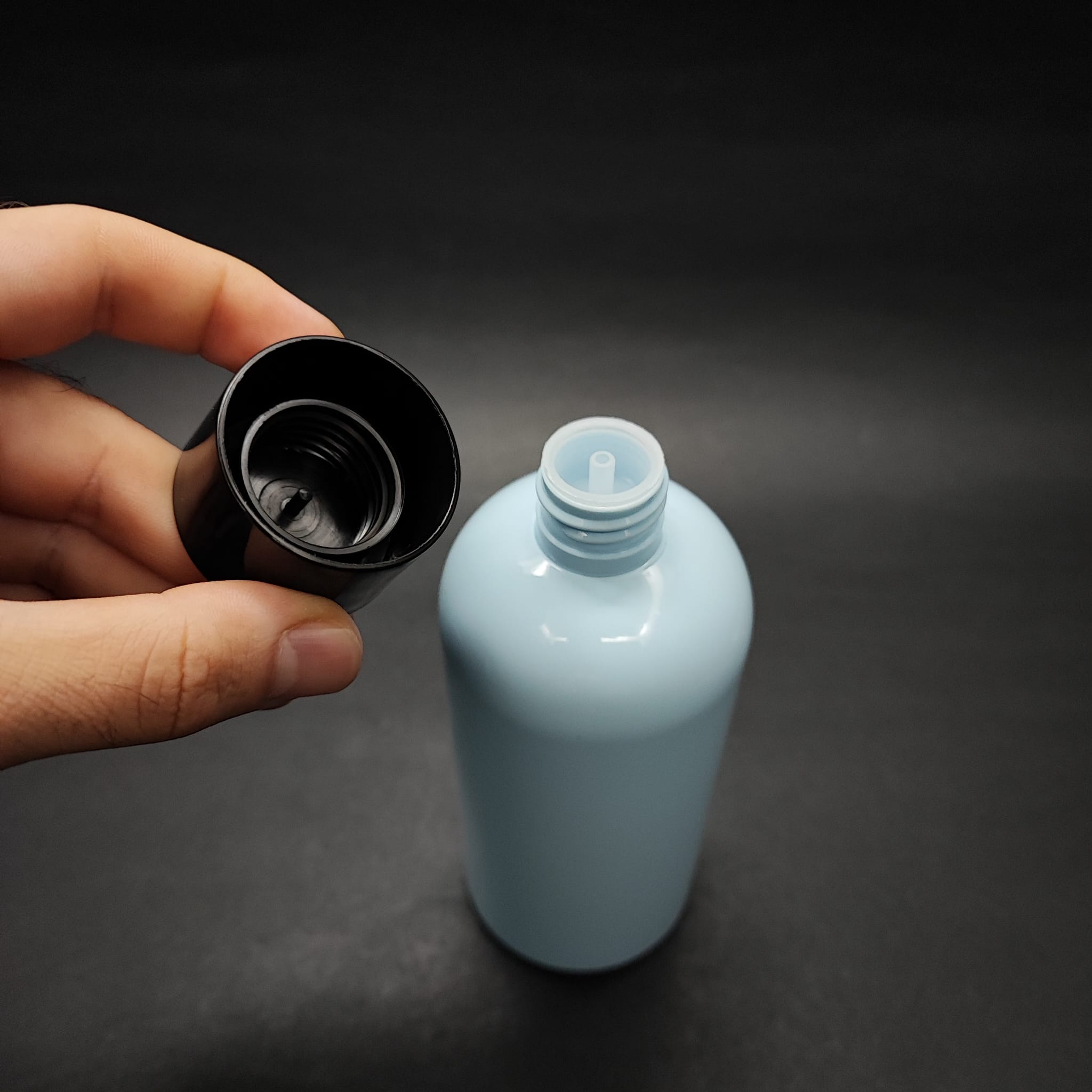 400 CC OVAL BOYUNLU UZUN SİLİNDİR PET ŞİŞE (30 GR) - SİYAH KOLONYA LOSYON KAPAK + TIPA - 400 ML PLASTİK ŞİŞE - BEBEK MAVİSİ - 210 adet