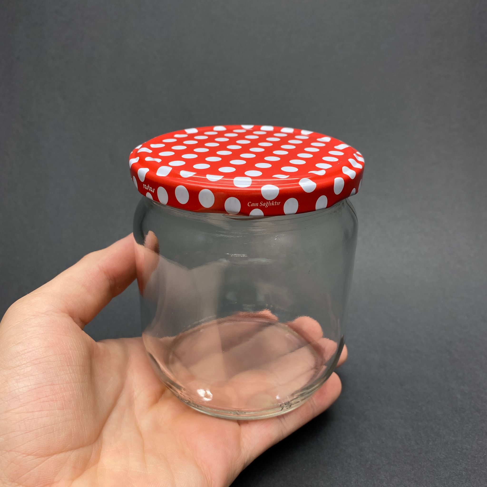 425 CC CAM KAVANOZ - KIRMIZI PUANTİYE DESENLİ METAL KAPAKLI - 425 ML CAM KAVANOZ - KONSERVE KAVANOZU - 50 adet