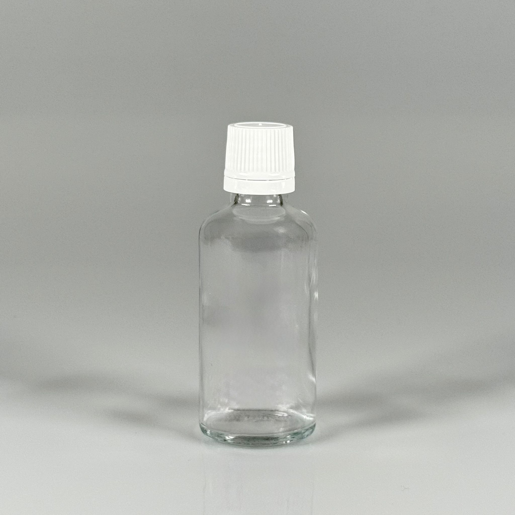 50 CC CAM ŞEFFAF KİLİTLİ, KENDİNDEN CONTALI BEYAZ KAPAKLI - 50 ML DAR AĞIZLI İLAÇ ŞİŞESİ - 264 adet