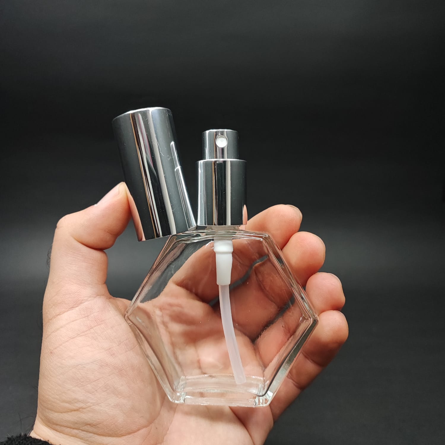 50 ML LÜKS VİDALI VALF ÇEVİRME PARFÜM ŞİŞELERİ - 50 CC ALTIGEN ŞEFFAF CAM ŞİŞE - GÜMÜŞ METAL SPREYLİ KAPAKLI SET - 162 adet