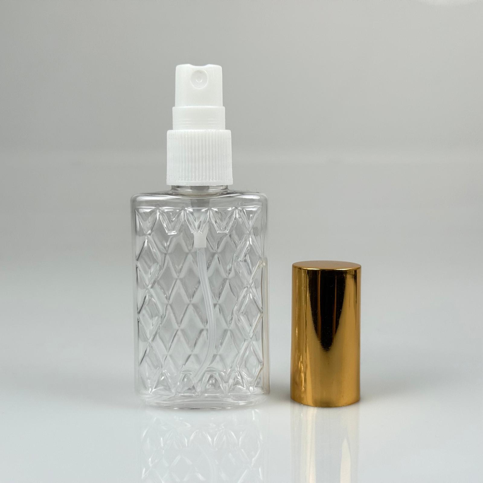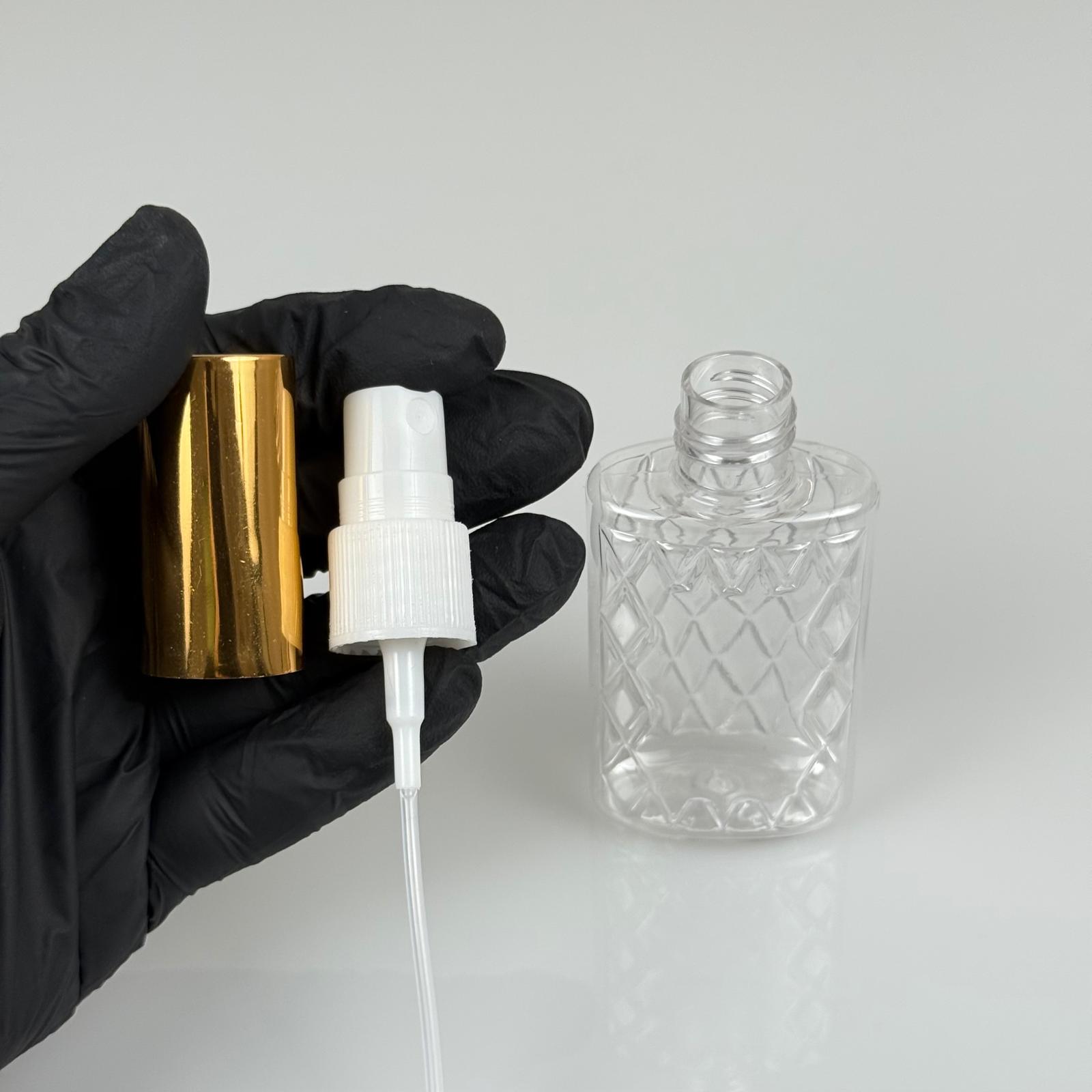50 ML PET KOLONYA, PARFÜM VB ŞİŞELERİ - METAL ALÜMİNYUM GOLD KAPAK + VİDALI SPREY + 50 CC KÖŞELİ ŞEFFAF ŞİŞE SET TAKIM - 1000 adet