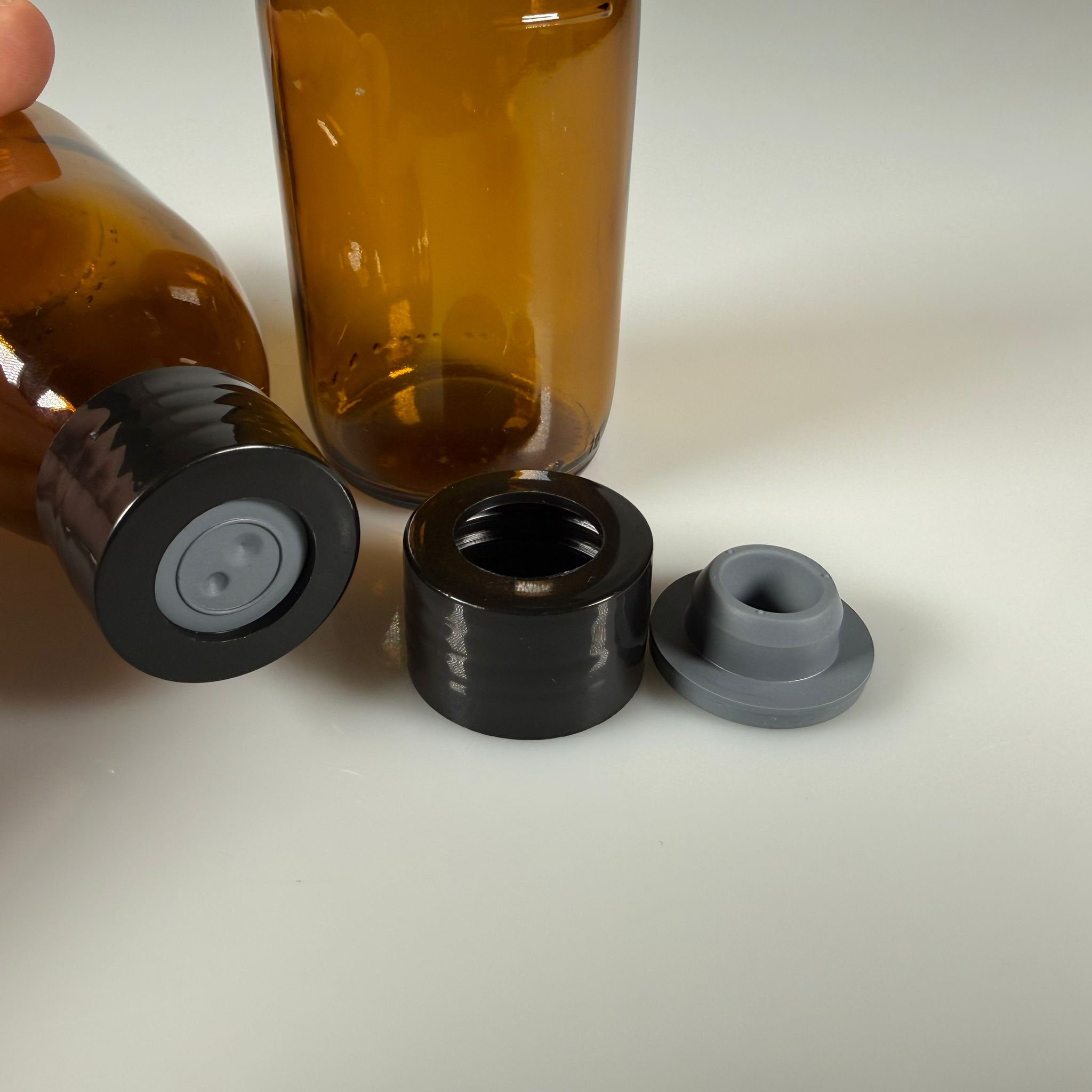 FLAKON ENJEKTÖR SERUM ŞİŞESİ - 125 ML AMBER ECZA CAM ŞİŞE + VİDALI DELİKLİ KAPAK (ELLE ÇEVİREREK KAPANIR) + KAUÇUK BUTİL TIPA TAKIM - 99 adet