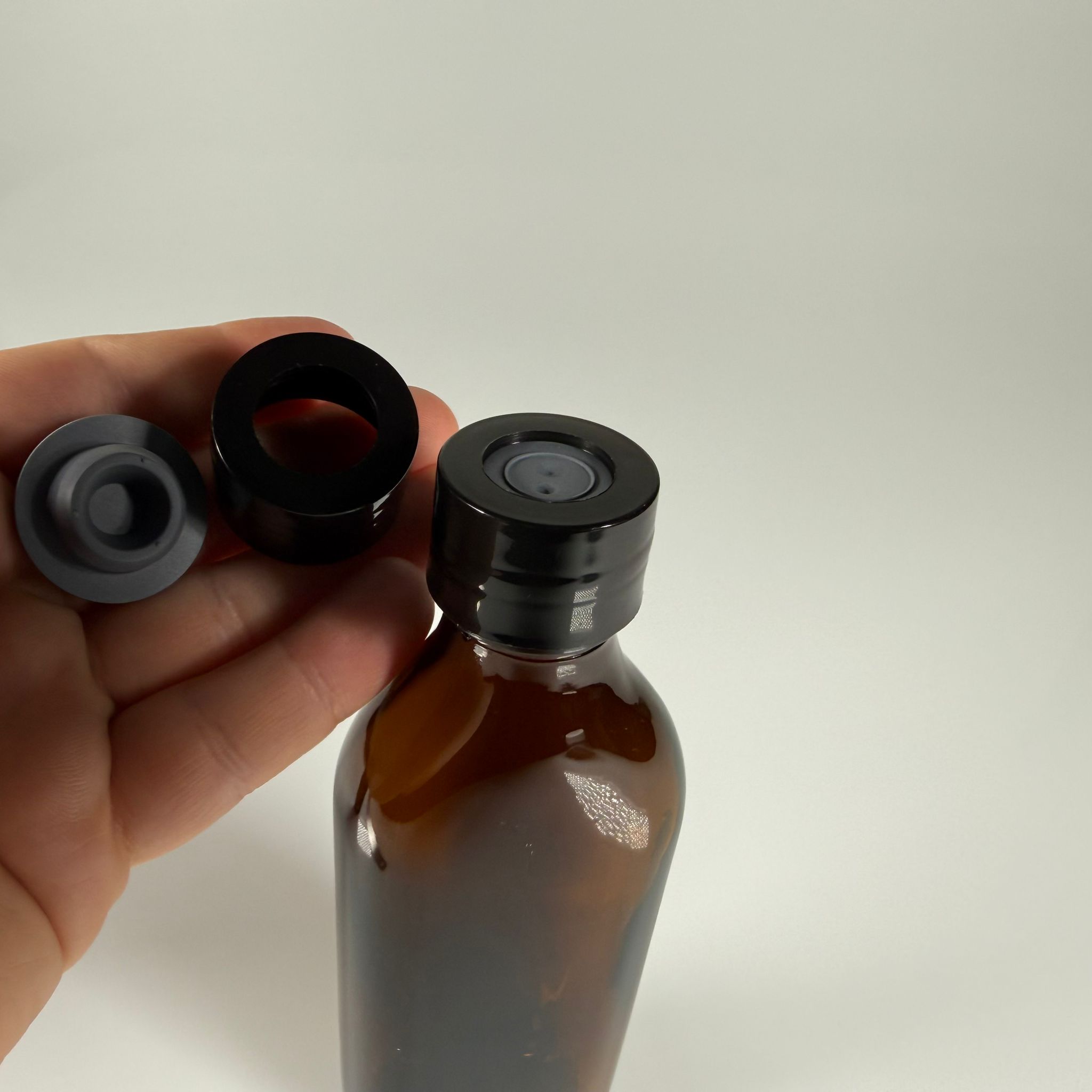 FLAKON ENJEKTÖR SERUM ŞİŞESİ - 150 ML YASSI ECZA CAM ŞİŞE + VİDALI DELİKLİ KAPAK (ELLE ÇEVİREREK KAPANIR) + KAUÇUK BUTİL TIPA TAKIM - 64 adet