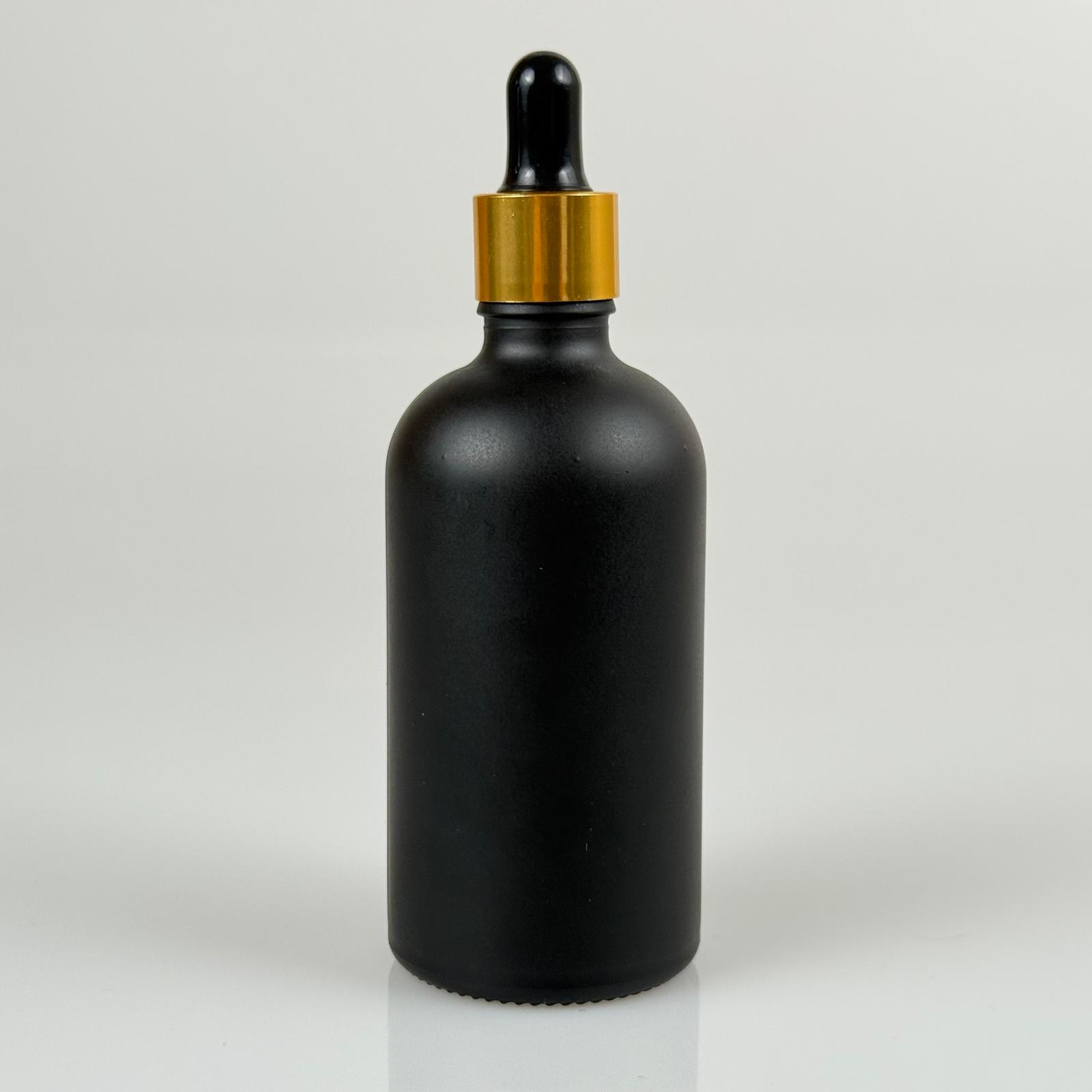 100 CC MAT SİYAH CAM ŞİŞE - CAM DAMLALIKLI TAKIM - 100 ML SİYAH CAM DAMLALIKLI CAM ŞİŞE - SİYAH EMZİK + GOLD METAL KAPAK - 90 adet