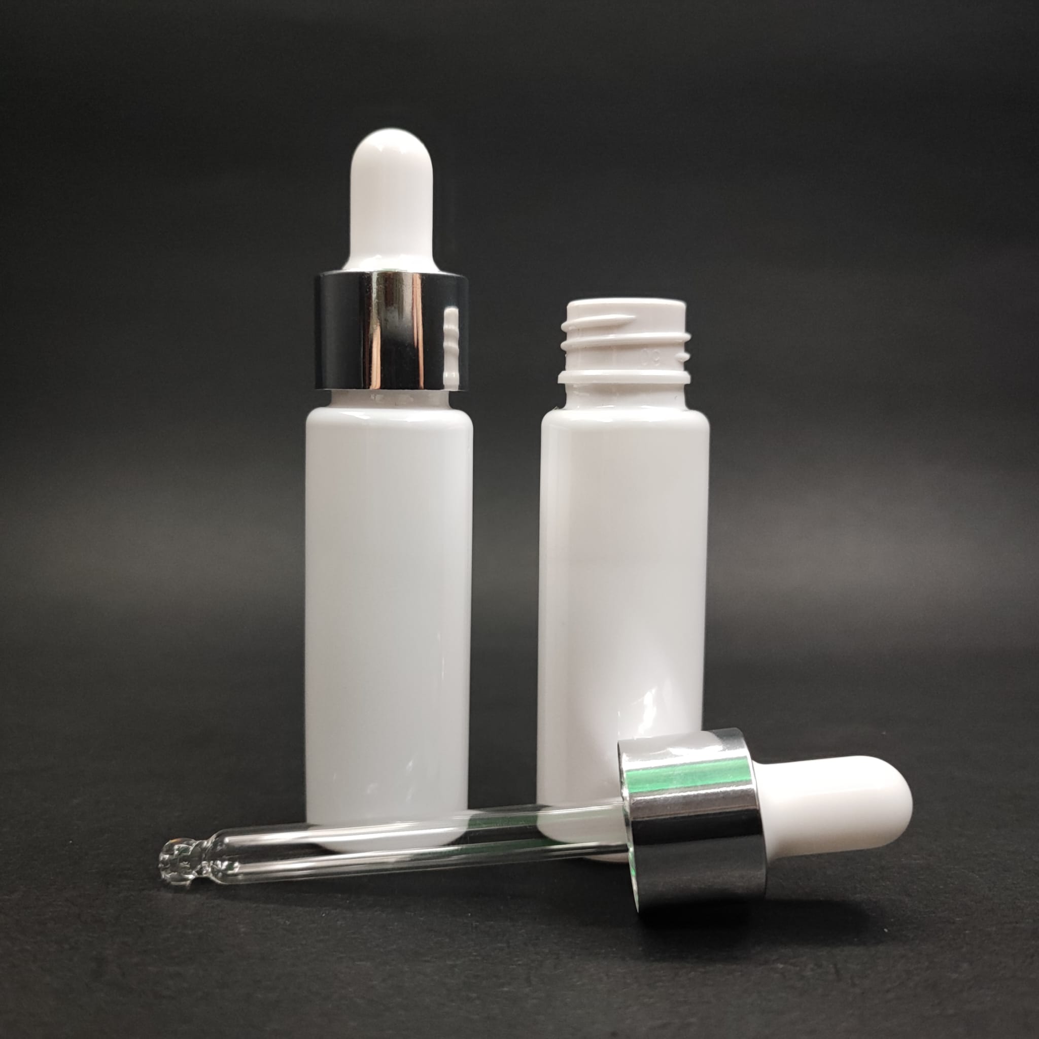 20 CC CAM DAMLALIKLI BEYAZ PLASTİK ŞİŞE - 20 ML DROPPER PET ŞİŞE + BEYAZ EMZİK + GÜMÜŞ KAPAK + CAM PİPET SET - 1500 adet