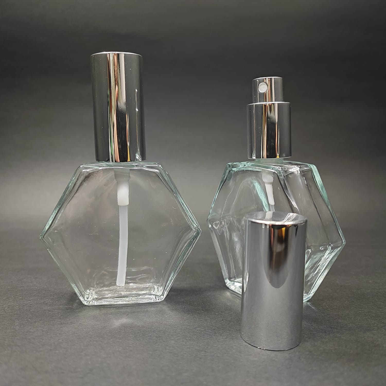 50 ML LÜKS VİDALI VALF ÇEVİRME PARFÜM ŞİŞELERİ - 50 CC ALTIGEN ŞEFFAF CAM ŞİŞE - GÜMÜŞ METAL SPREYLİ KAPAKLI SET - 162 adet