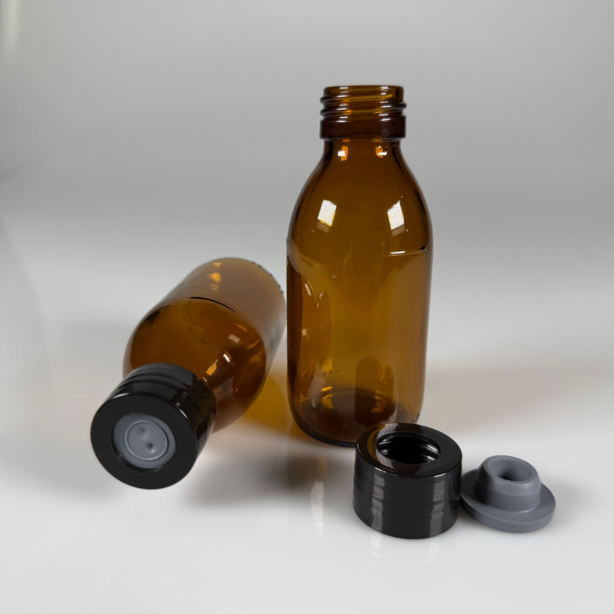 FLAKON ENJEKTÖR SERUM ŞİŞESİ - 125 ML AMBER ECZA CAM ŞİŞE + VİDALI DELİKLİ KAPAK (ELLE ÇEVİREREK KAPANIR) + KAUÇUK BUTİL TIPA TAKIM - 99 adet