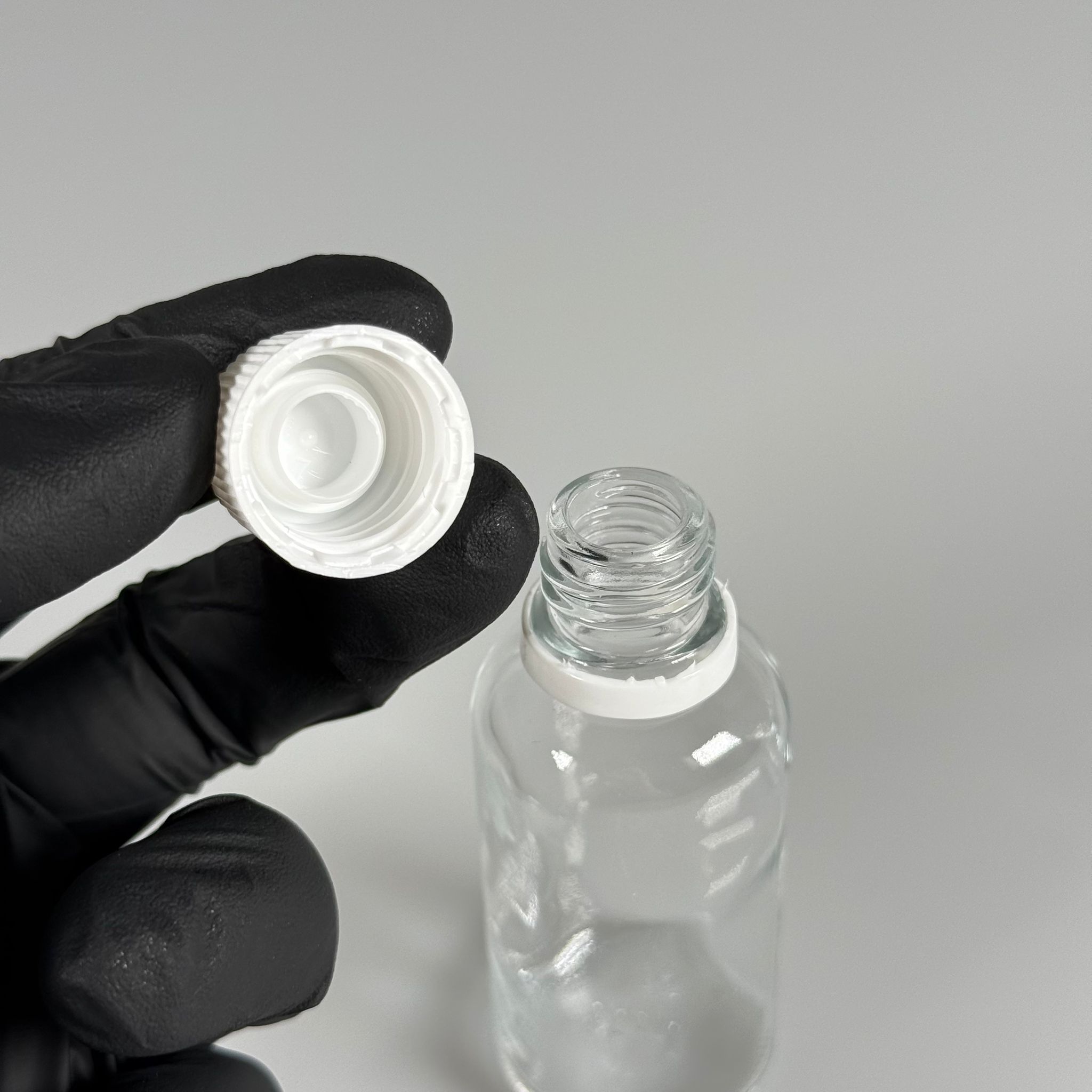 30 CC CAM ŞEFFAF KİLİTLİ, KENDİNDEN CONTALI BEYAZ KAPAKLI - 30 ML DAR AĞIZLI İLAÇ ŞİŞESİ - 330 adet