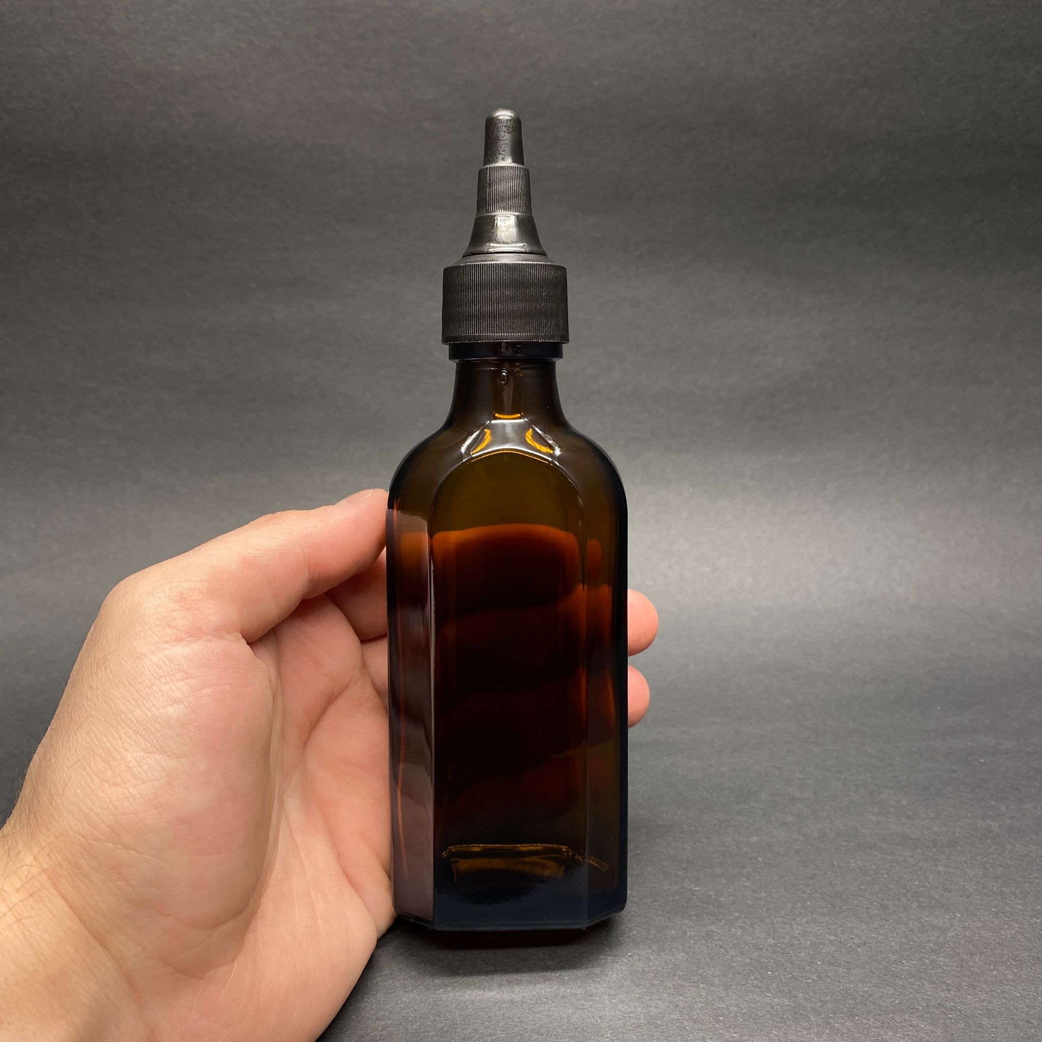 100 CC AMBER YASSI CAM ŞİŞE - SİYAH ASANSÖR AKITICILI KAPAKLI - 100 ML KAHVERENGİ YASSI MODEL CAM ŞİŞE - 140 adet