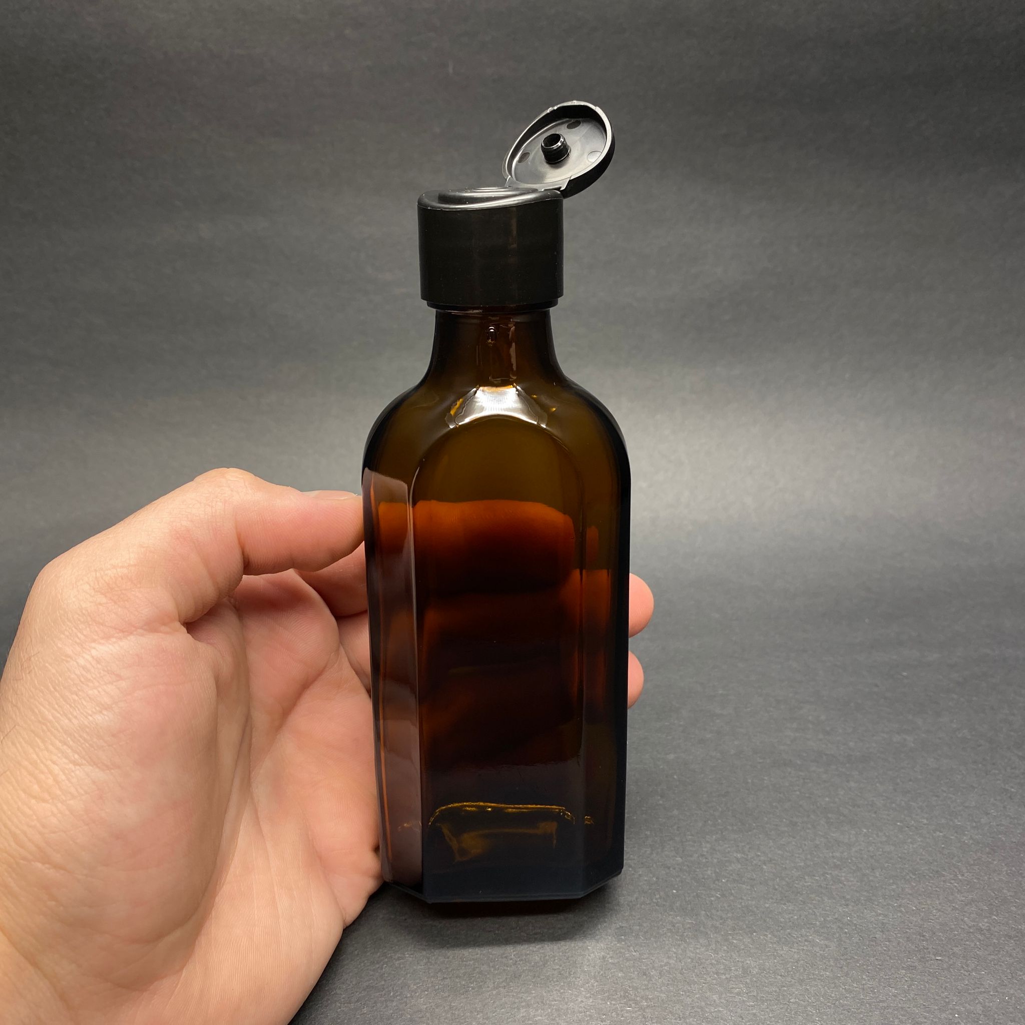 100 CC AMBER YASSI CAM ŞİŞE - SİYAH FARMASİ MODEL FLİPTOP AKITICILI KAPAKLI - 100 ML KAHVERENGİ YASSI MODEL CAM ŞİŞE - 140 adet