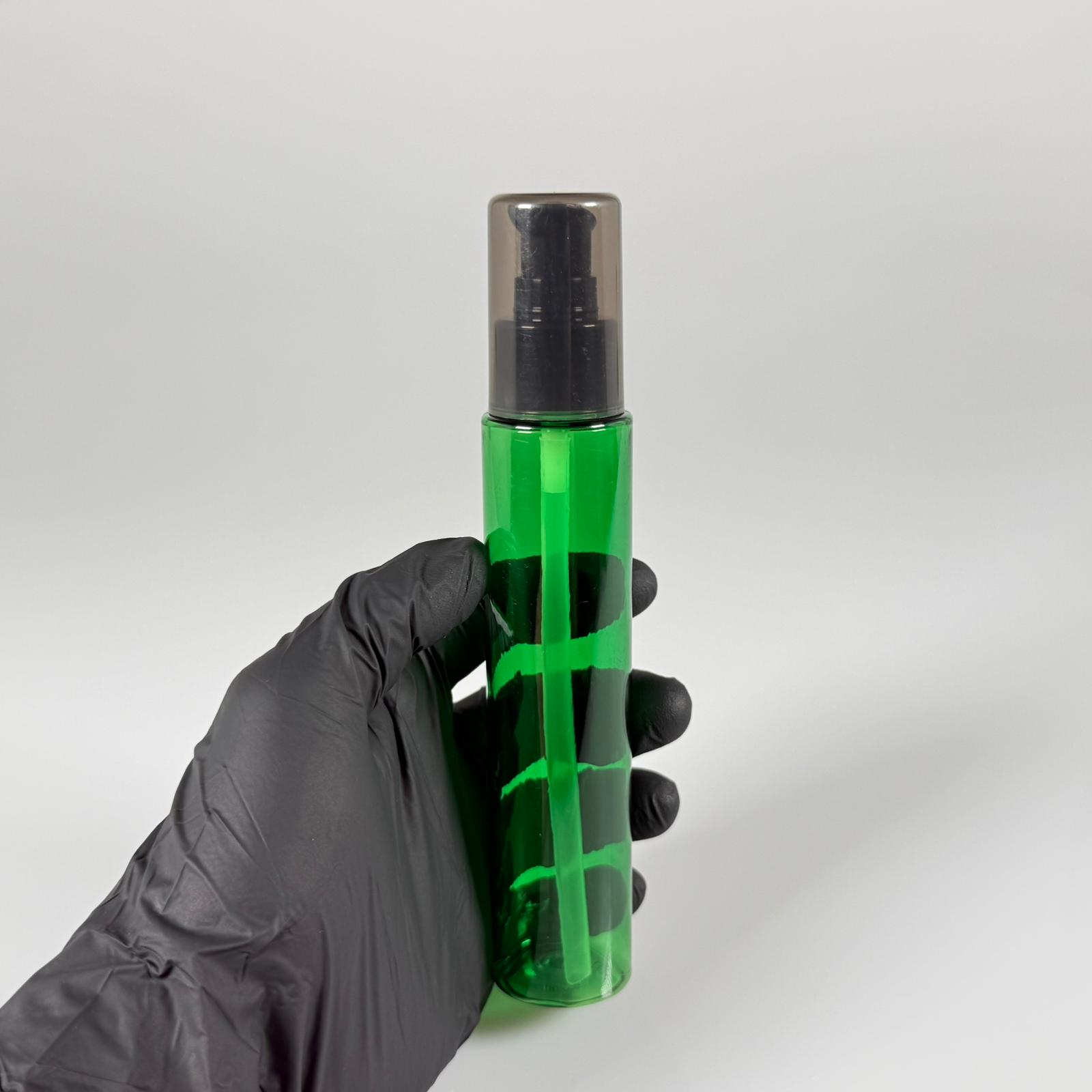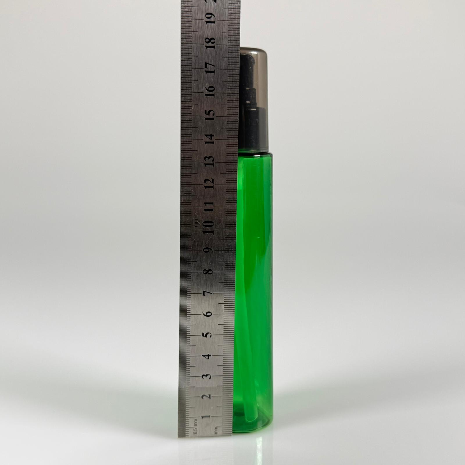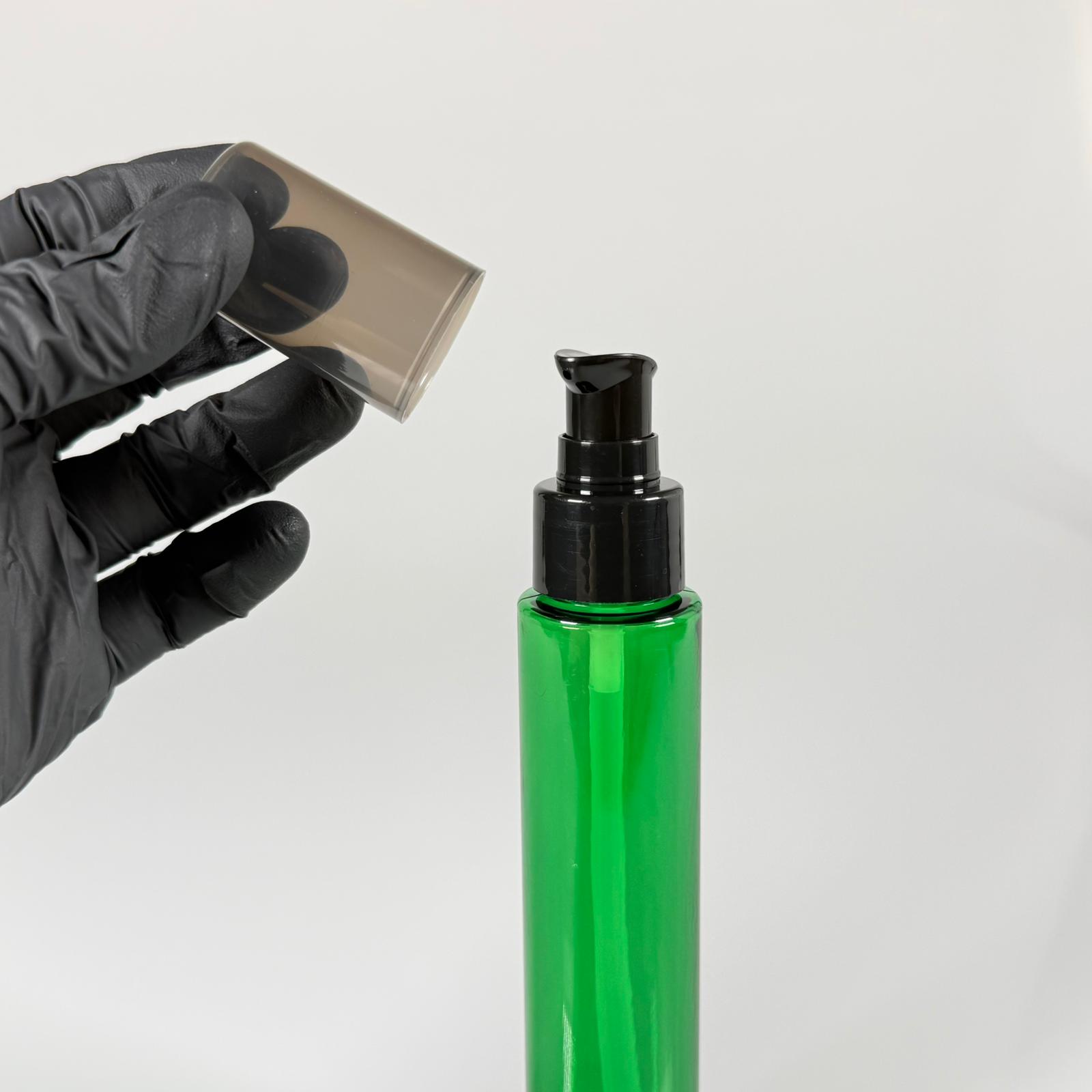 100 CC UZUN SİLİNDİR YEŞİL PET ŞİŞE (24 GR) - SİYAH LOSYON POMPALI - 100 ML BİBERİYE SUYU, LAVANTA YAĞI, SAÇ SERUM, TONİK VB İÇİN PLASTİK KOZMETİK AMBALAJLARI - 1000 adet
