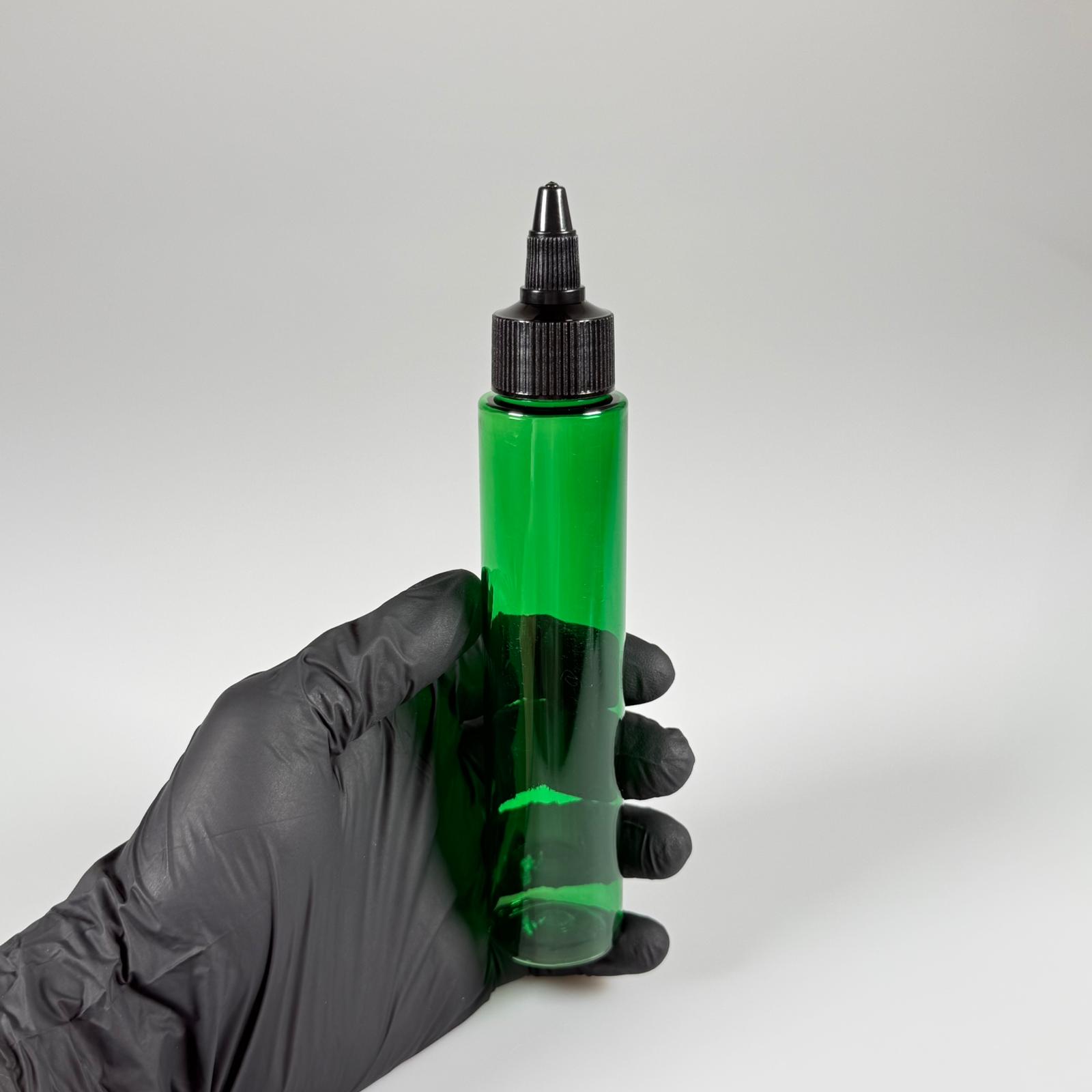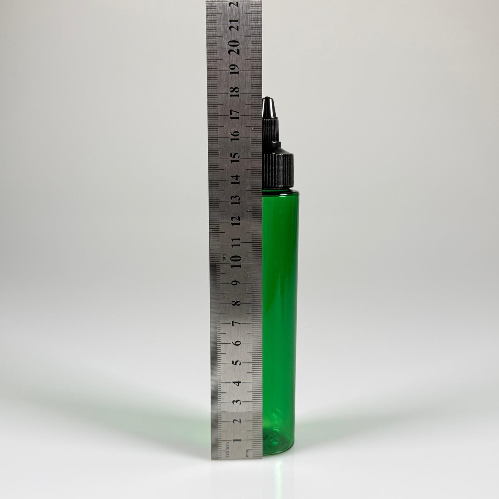 100 CC UZUN SİLİNDİR YEŞİL PET ŞİŞE (24 GR) - SİYAH TWİST SİVRİ ASANSÖR AKITICI KAPAKLI - 100 ML BİBERİYE SUYU, LAVANTA YAĞI, SAÇ SERUM, TONİK VB İÇİN PLASTİK KOZMETİK AMBALAJLARI - 1820 adet
