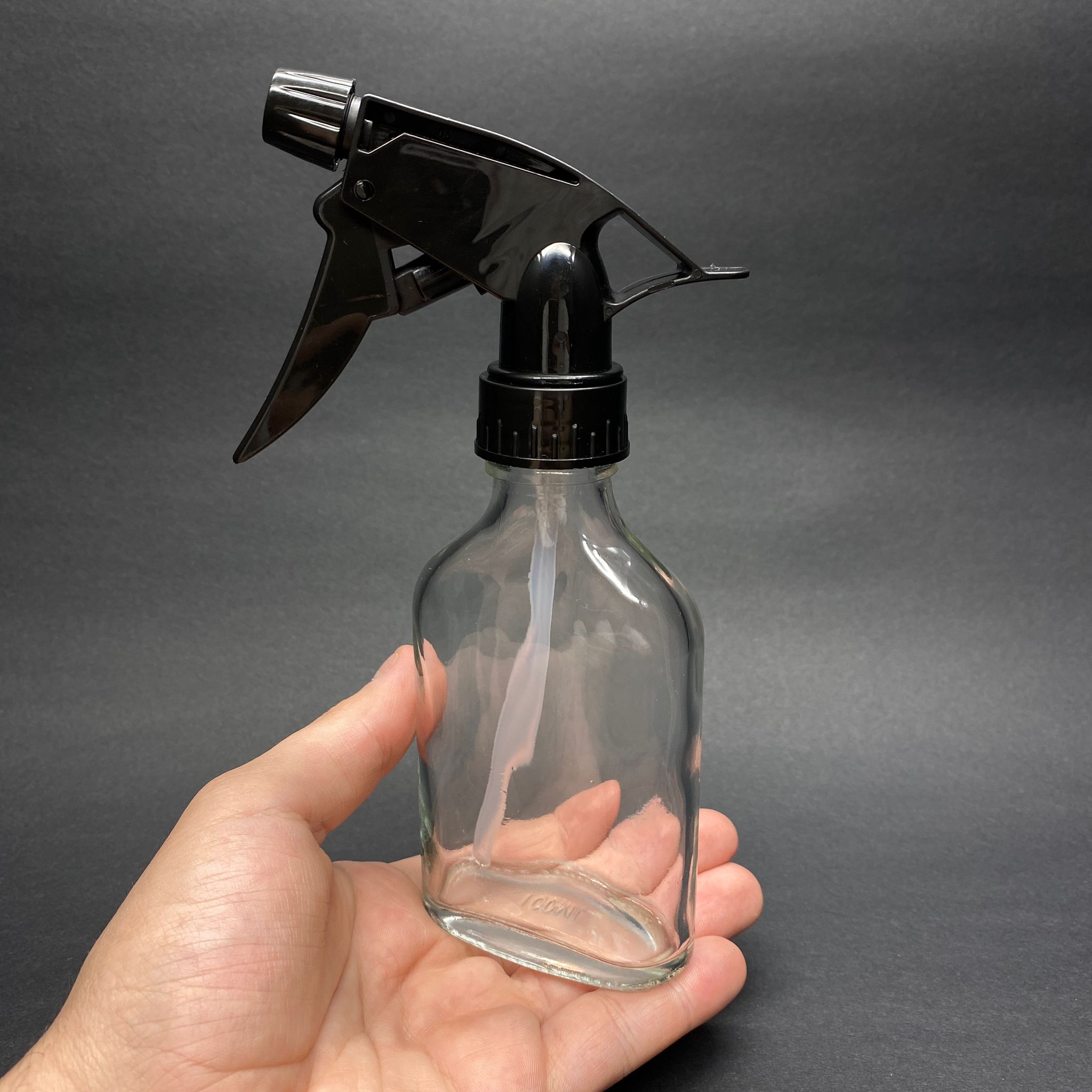 100 CC YASSI CAM ŞİŞE - DOZAJLI KİMYASALA DAYANIKLI SİYAH TRİGER TETİK SPREYLİ - 100 ML TEMİZLİK , ODA PARFÜMÜ , KİMYASAL , BERBER VB İÇİN YASSI CAM ŞİŞE - 240 adet