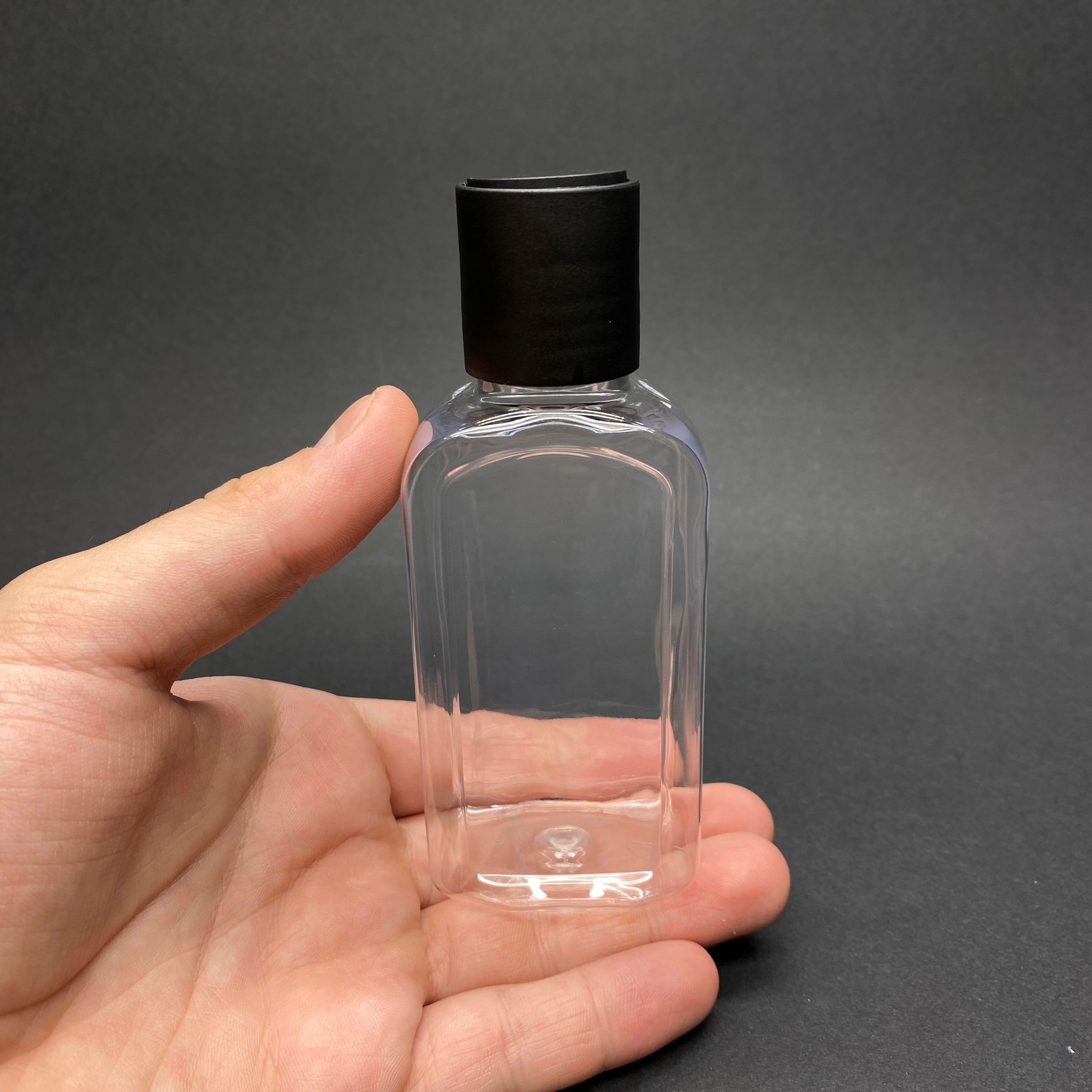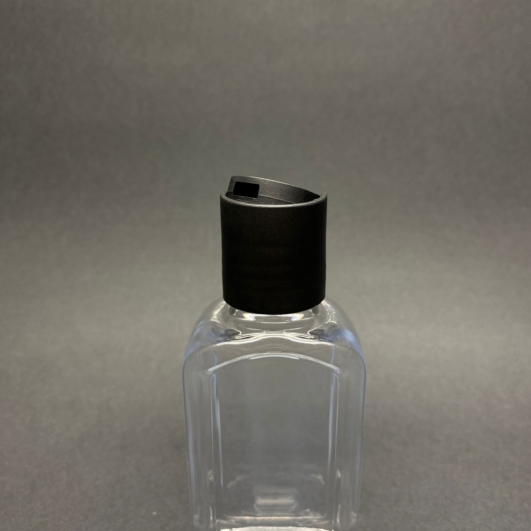 100 CC YASSI MODEL PET ŞİŞE - SİYAH DİSKTOP ŞAMPUAN KAPAKLI - AĞIZ ÇAPI 24 MM - ŞEFFAF - 600 adet
