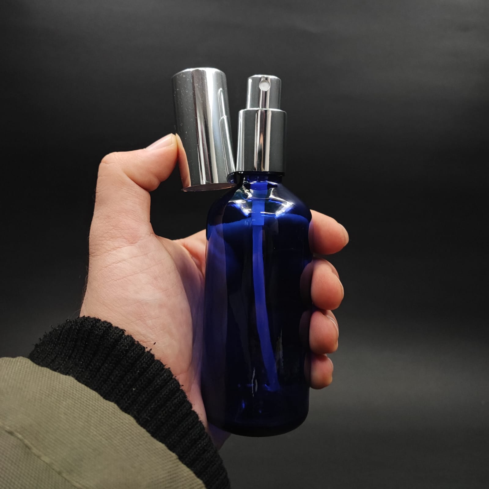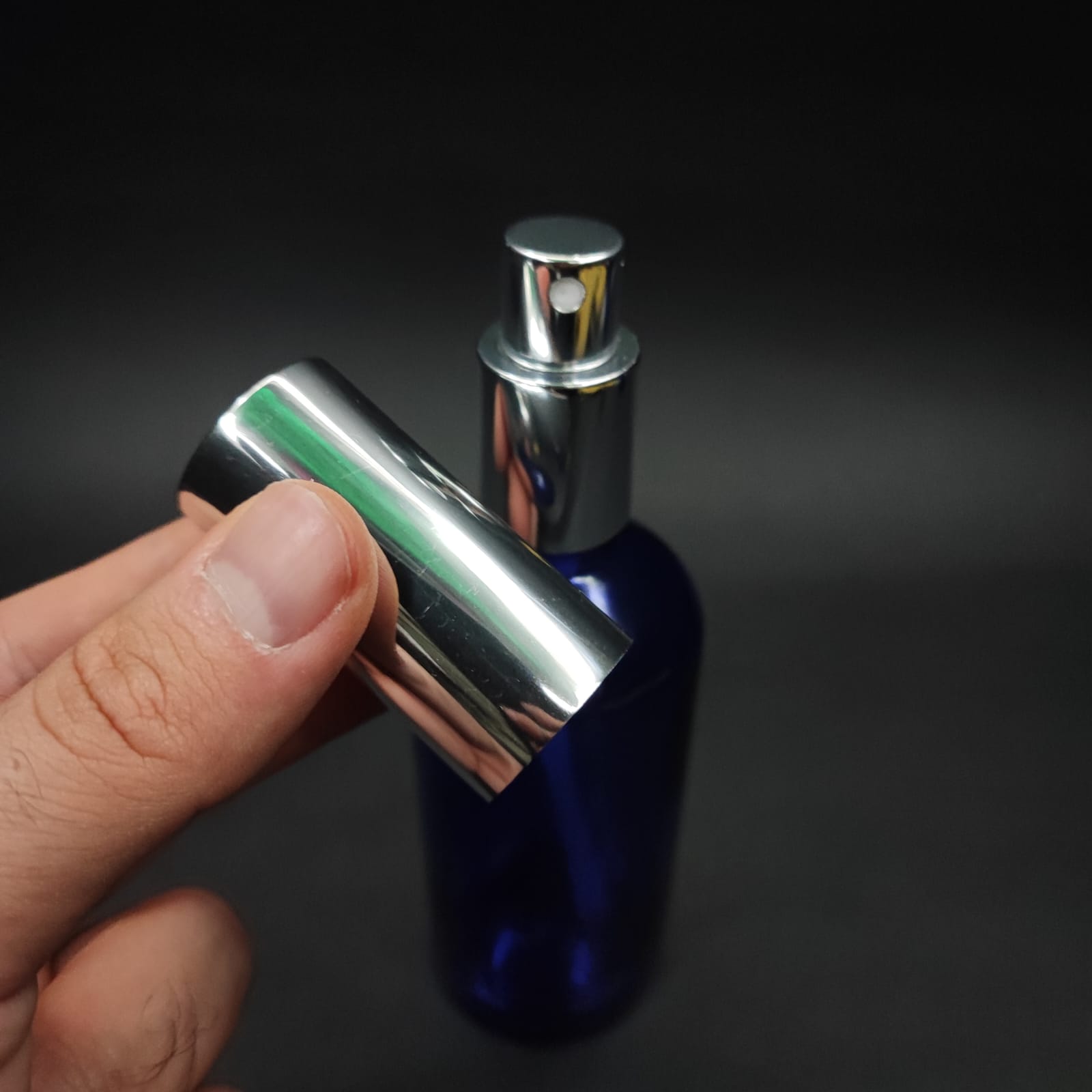 100 ML LÜKS VİDALI VALF ÇEVİRME PARFÜM ŞİŞELERİ - 100 CC MAVİ CAM ŞİŞE - GÜMÜŞ METAL SPREYLİ KAPAKLI SET - 70 adet