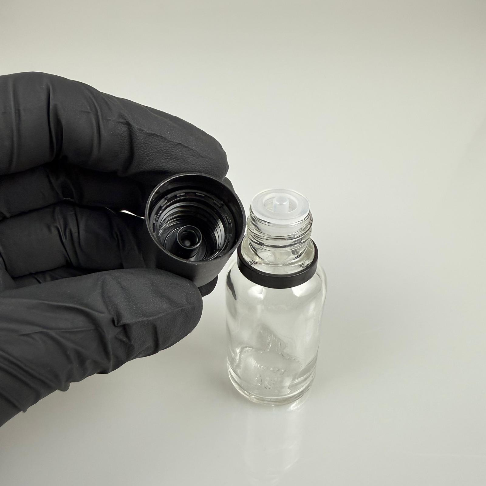 15 CC ŞEFFAF CAM ŞİŞE + İÇTEN DAMLALIKLI ÇOCUK KİLİTLİ SİYAH KAPAK - SAYDAM 15 ML KİLİT KAPAKLI DAMLATMALI ŞİŞE - 200 adet
