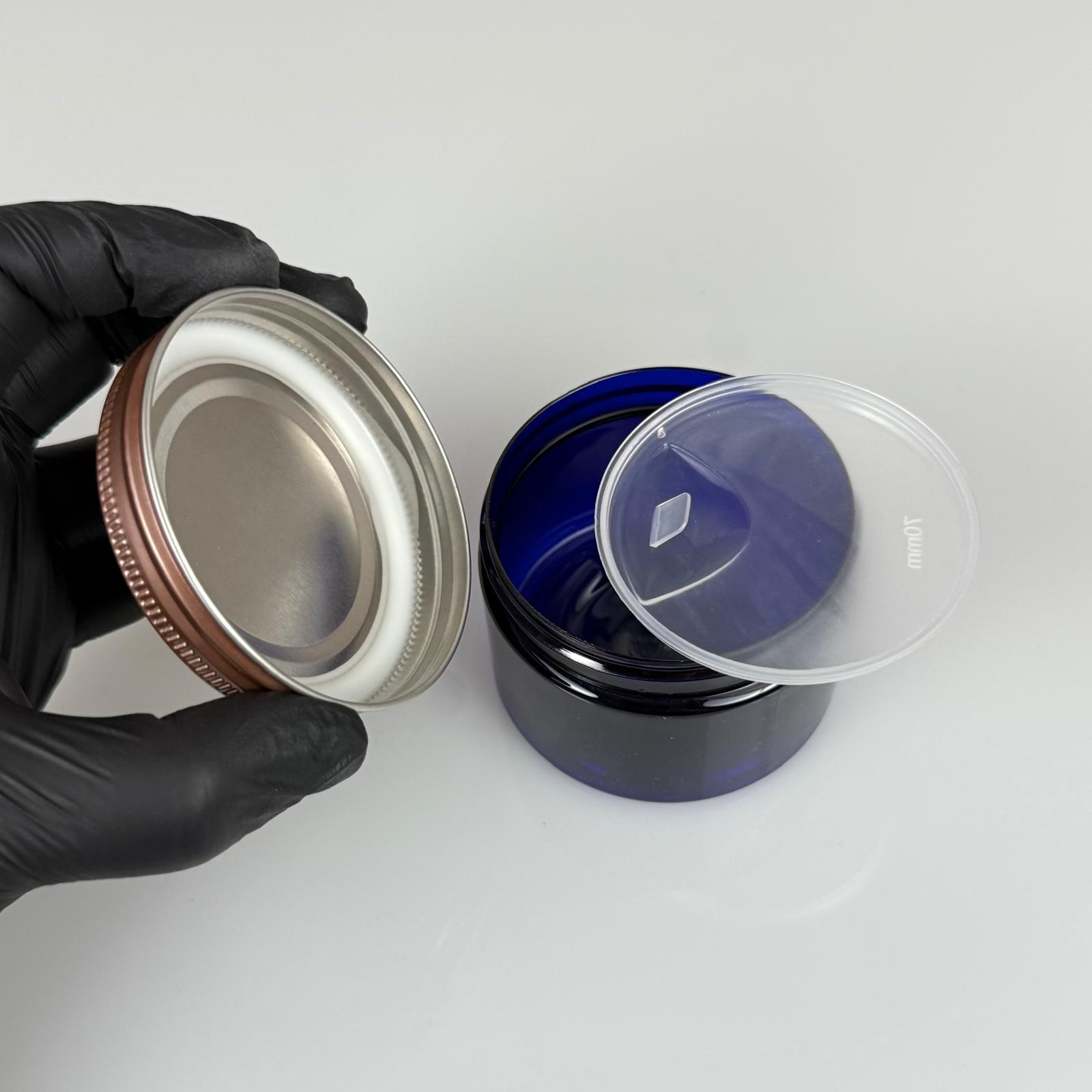150 ML SERT PET KAVANOZ + BRONZ METAL KAPAK + İÇ TIPA - 150 CC KALIN MAVİ PLASTİK KAVANOZ BRONZ METAL KAPAKLI İÇ TIPALI TAKIM - KREM KAVANOZLARI - 572 adet