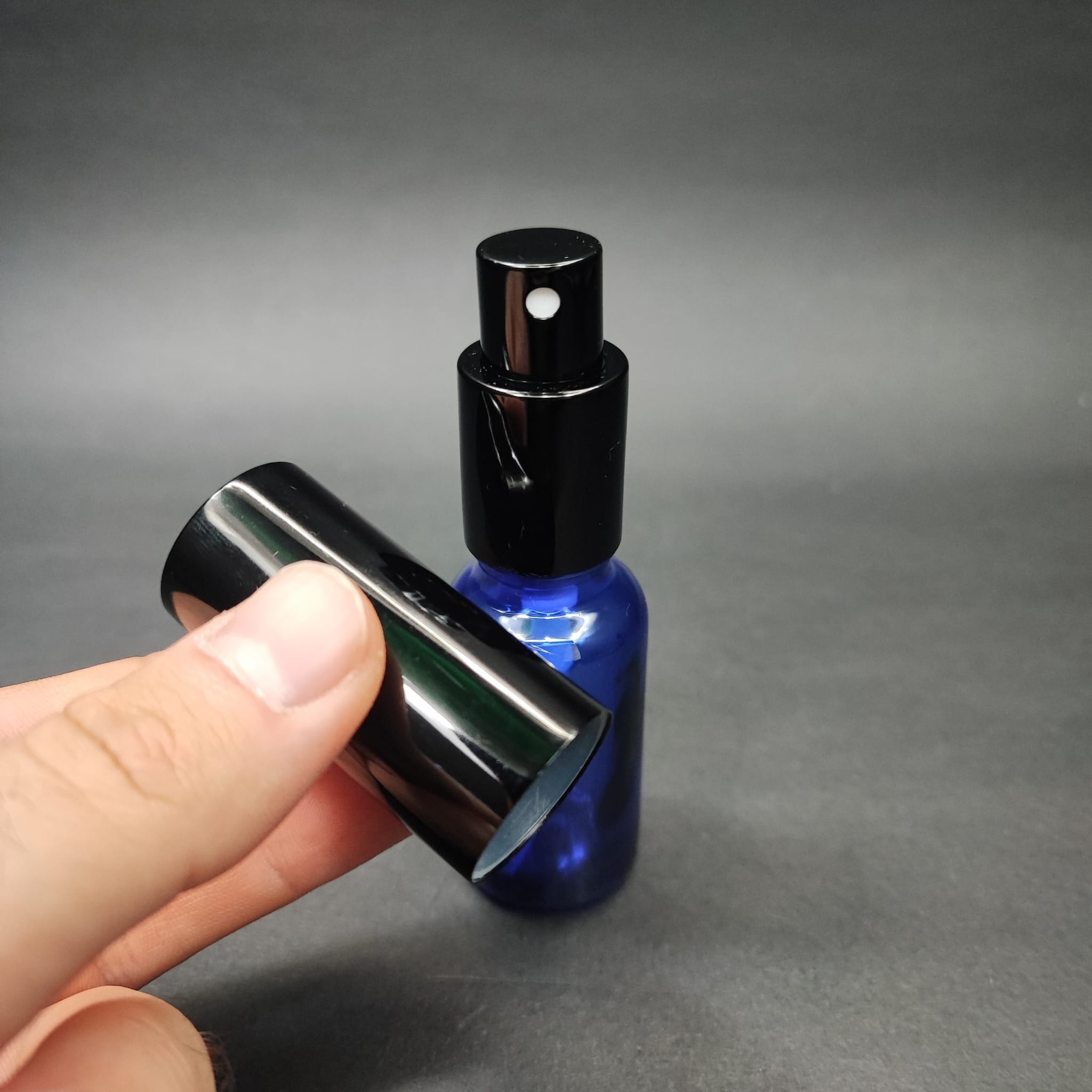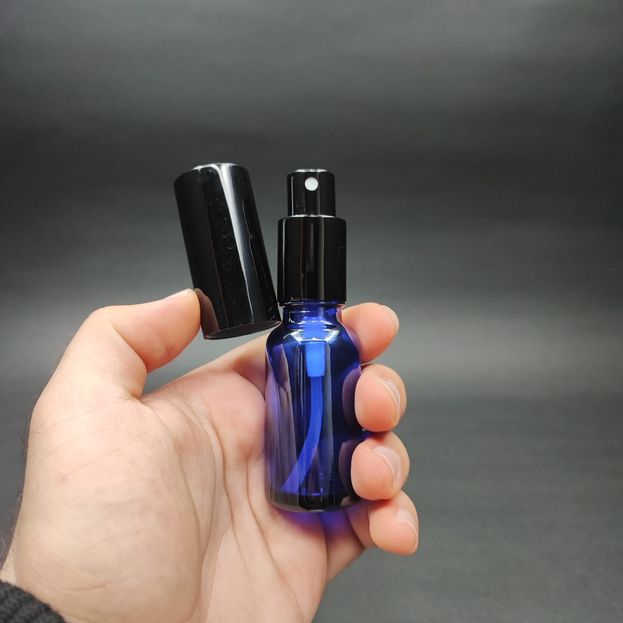 20 ML LÜKS VİDALI VALF ÇEVİRME PARFÜM ŞİŞELERİ - 20 CC MAVİ CAM ŞİŞE - SİYAH METAL SPREYLİ KAPAKLI SET - 156 adet