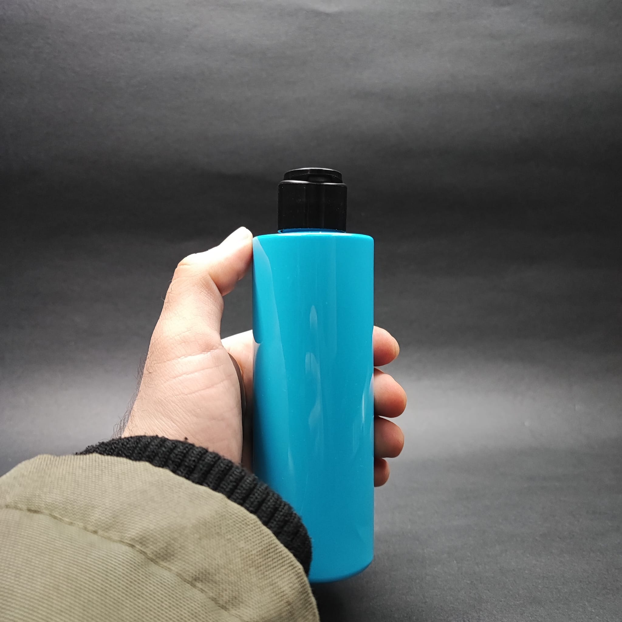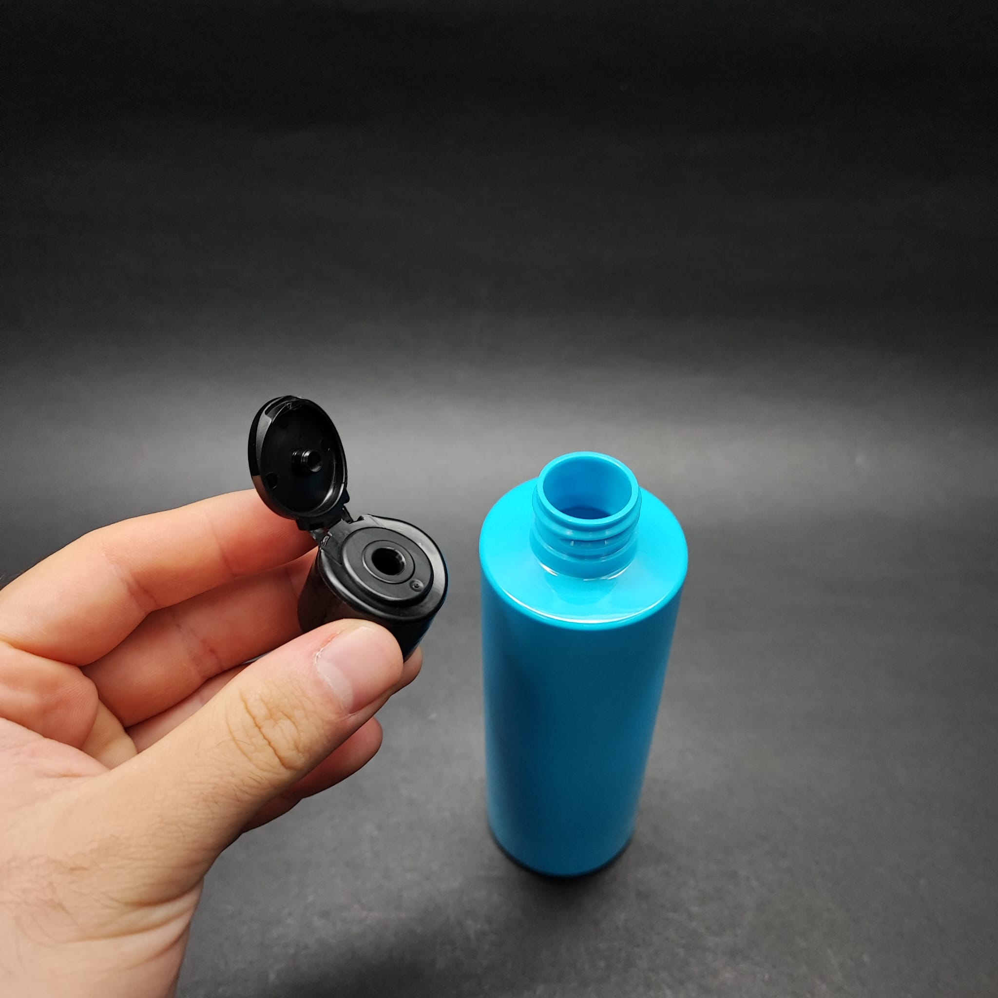200 CC KÜT BOYUNLU UZUN SİLİNDİR PET ŞİŞE (24 GR) - SİYAH FARMASİ MODEL FLİPTOP KAPAKLI - 200 ML PLASTİK ŞİŞE - MAVİ - 390 adet