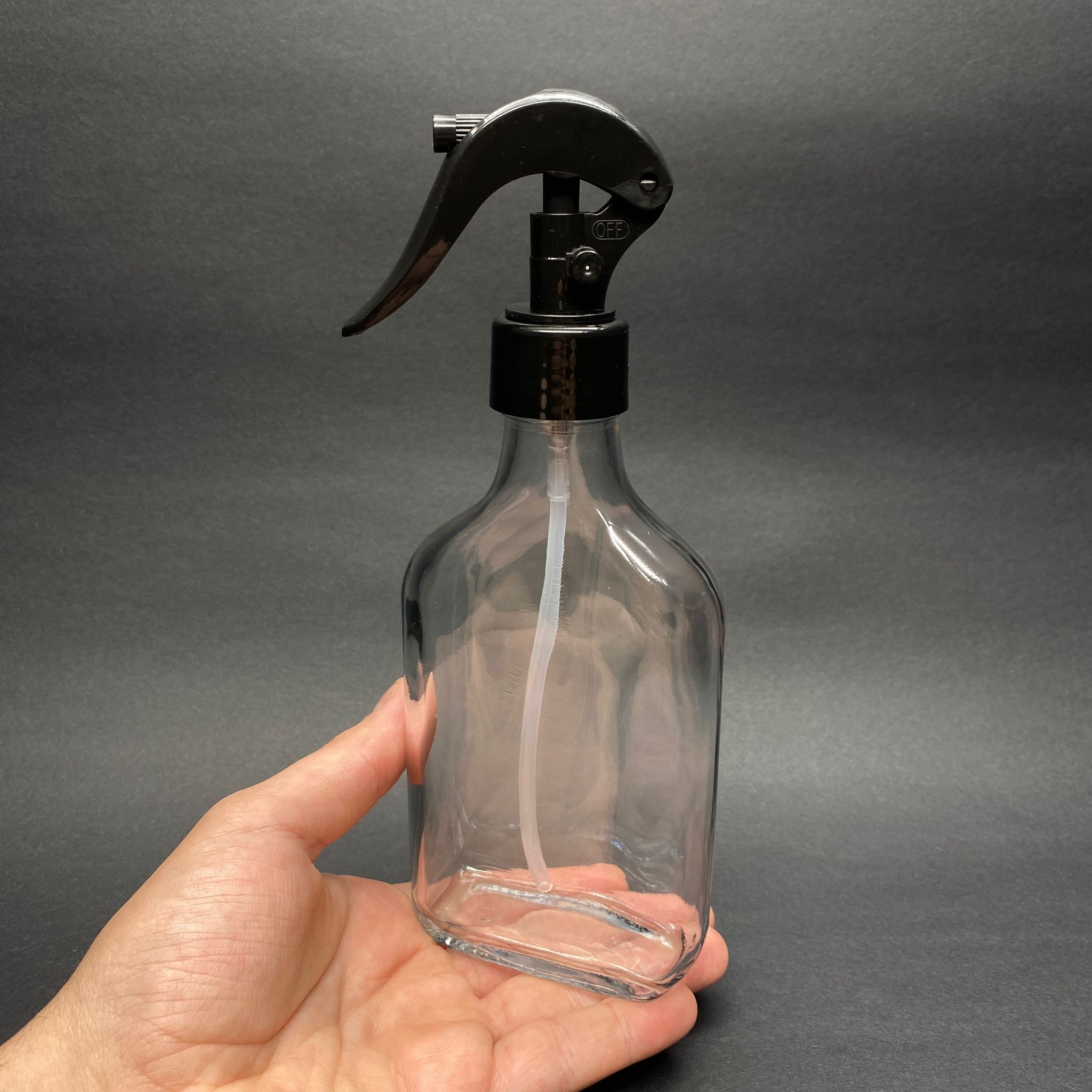 200 CC YASSI CAM ŞİŞE - SİYAH TRİGER SPREYLİ (DUMAN PÜSTÜRTÜR) - 200 ML TEMİZLİK , ODA PARFÜMÜ , CAMSİL VB İÇİN YASSI CAM ŞİŞE - 180 adet