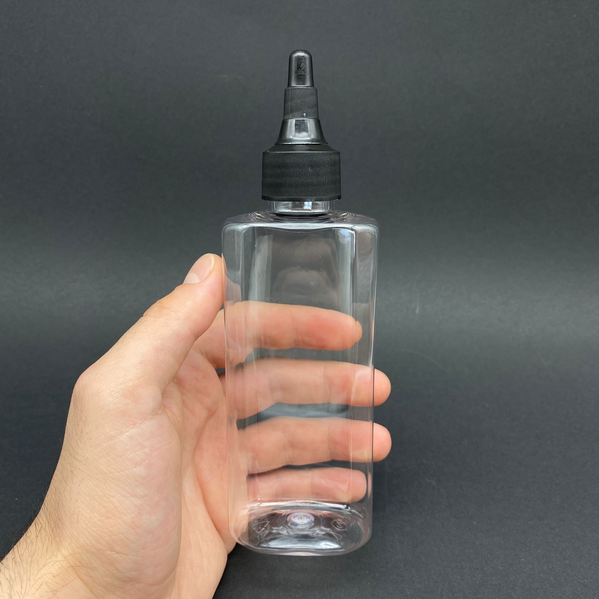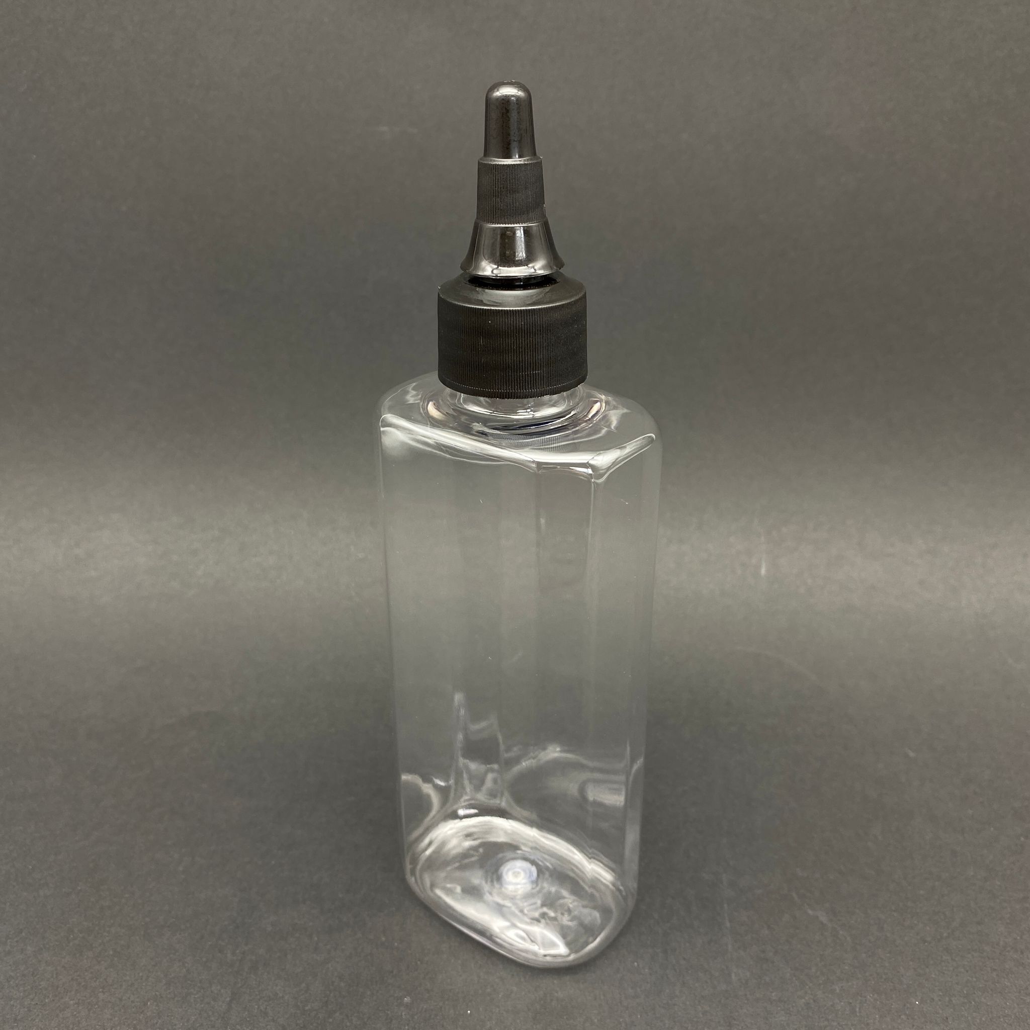 200 CC YASSI PET ŞİŞE - SİYAH ASANSÖR AKITICI KAPAKLI - 200 ML PLASTİK AKITICILI ŞİŞE - 500 adet