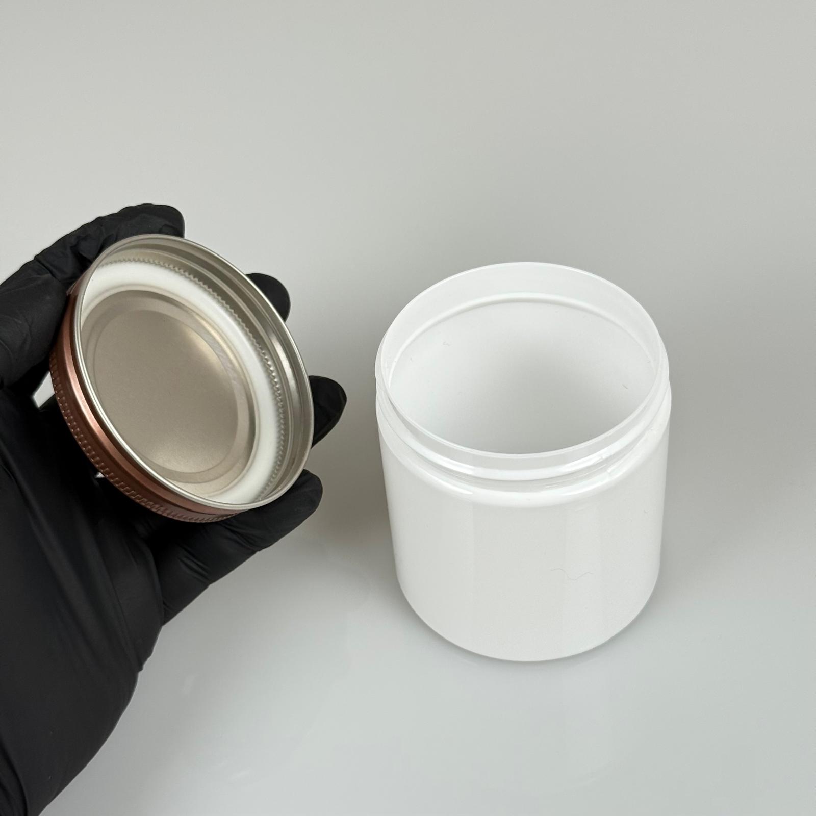 250 CC BEYAZ SERT PLASTİK KAVANOZ - BRONZ METAL KAPAKLI - 250 ML METAL KAPAKLI PLASTİK KAVANOZ - KOZMETİK KAVANOZ, GIDA KAVANOZU VE KREM KAVANOZU OLARAK KULLANABİLİRSİNİZ - 300 adet