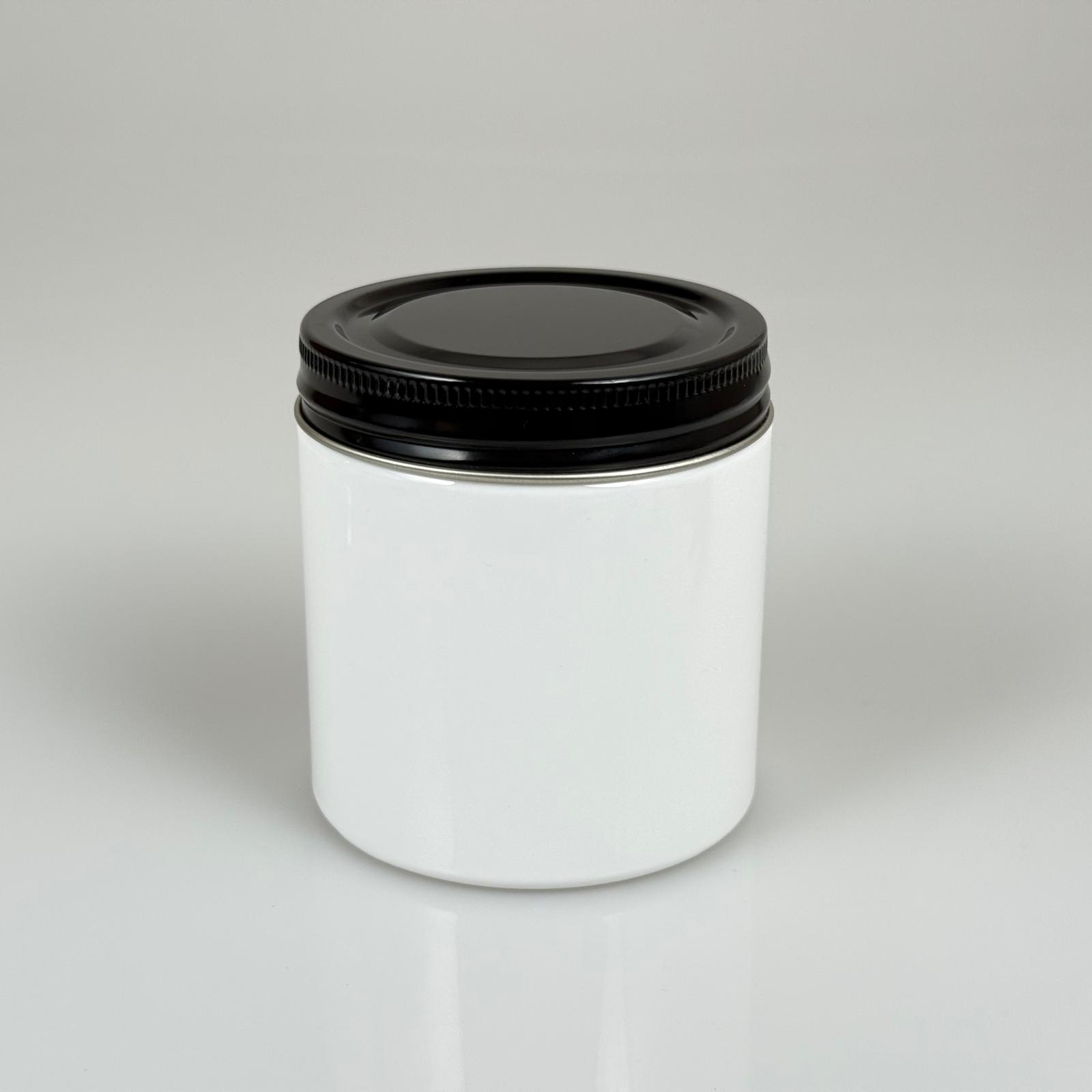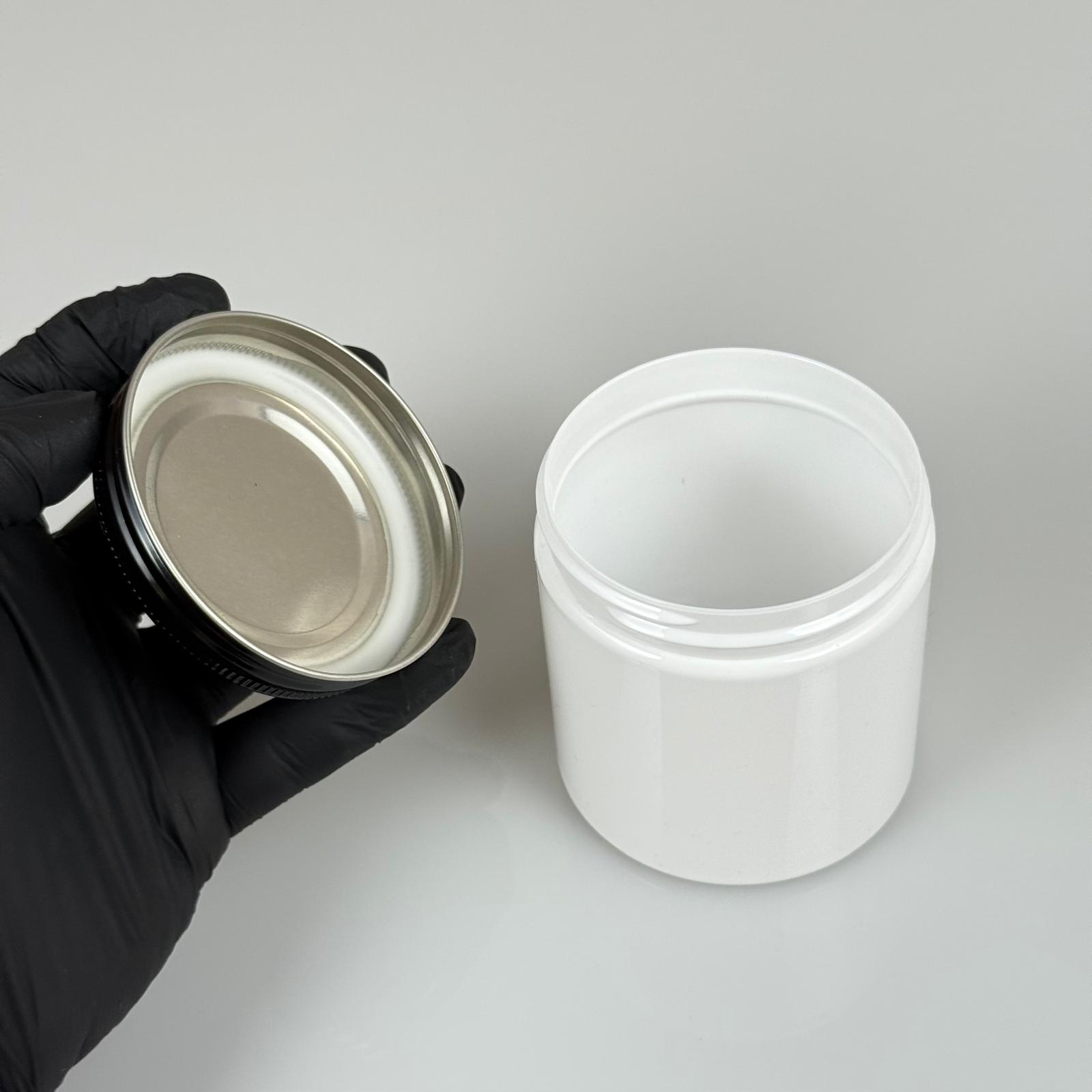 250 CC BEYAZ SERT PLASTİK KAVANOZ - SİYAH METAL KAPAKLI - 250 ML METAL KAPAKLI PLASTİK KAVANOZ - KOZMETİK KAVANOZ, GIDA KAVANOZU VE KREM KAVANOZU OLARAK KULLANABİLİRSİNİZ - 300 adet