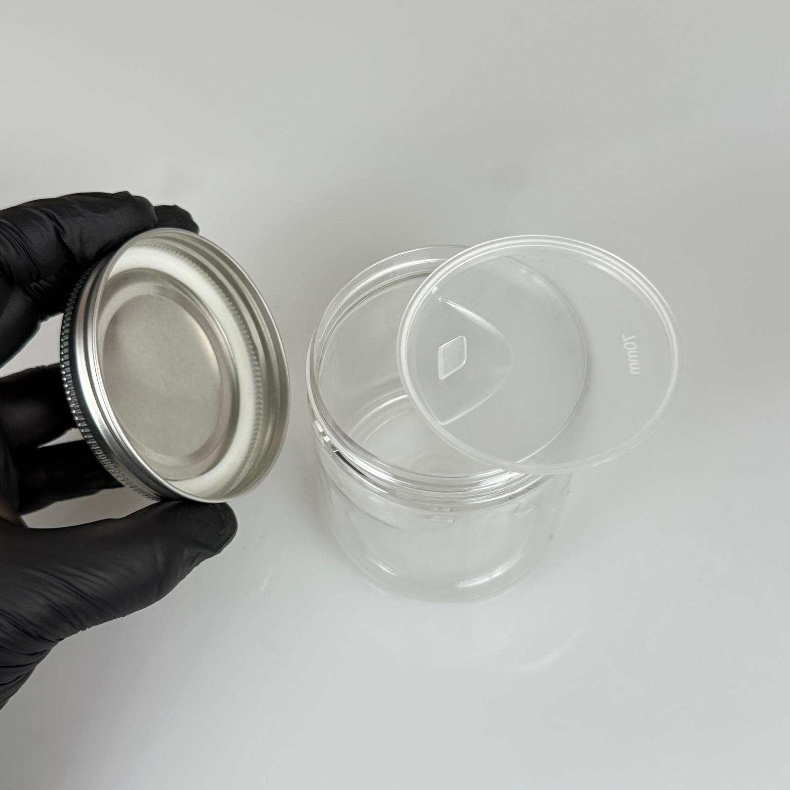250 ML SERT PET KAVANOZ + GÜMÜŞ METAL KAPAK + İÇ TIPA - 250 CC KALIN ŞEFFAF PLASTİK KAVANOZ GÜMÜŞ METAL KAPAKLI İÇ TIPALI TAKIM - KREM KAVANOZLARI - 330 adet