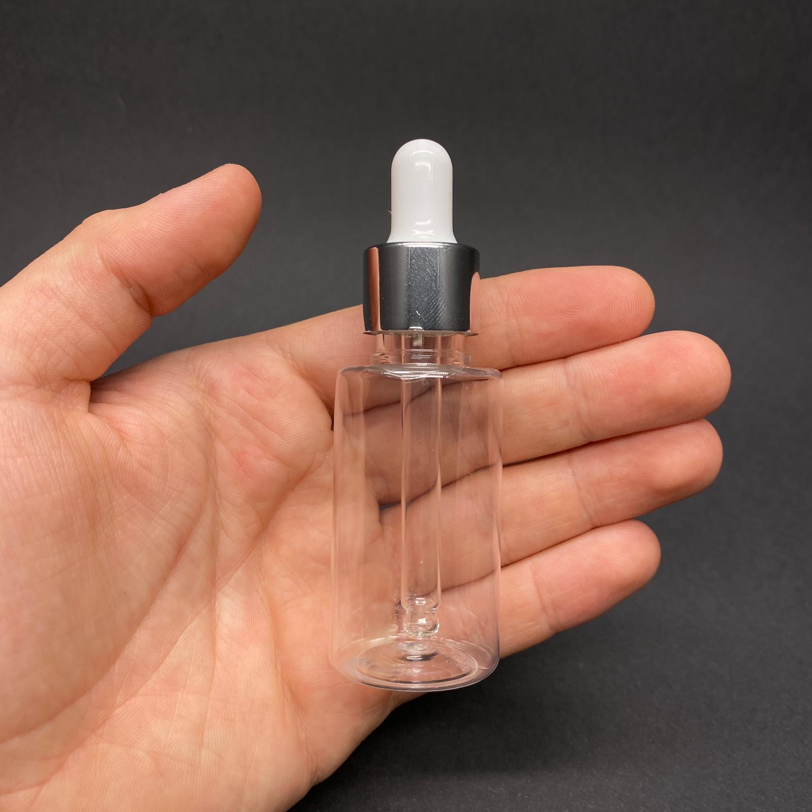 30 CC PET ŞİŞE SİLİNDİR KISA MODEL - CAM DAMLALIKLI (BEYAZ EMZİK, GÜMÜŞ METAL DELİKLİ KAPAK, CAM PİPET) - 30 ML CAM DAMLALIKLI PET ŞİŞE - 2000 adet