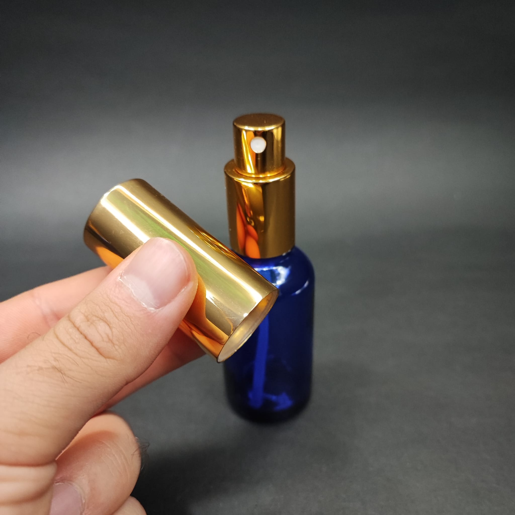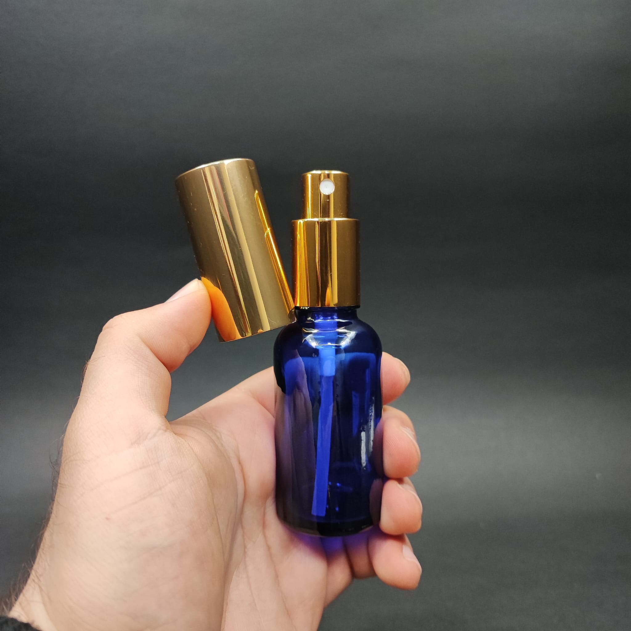 30 ML LÜKS VİDALI VALF ÇEVİRME PARFÜM ŞİŞELERİ - 30 CC MAVİ CAM ŞİŞE - GOLD METAL SPREYLİ KAPAKLI SET - 110 adet
