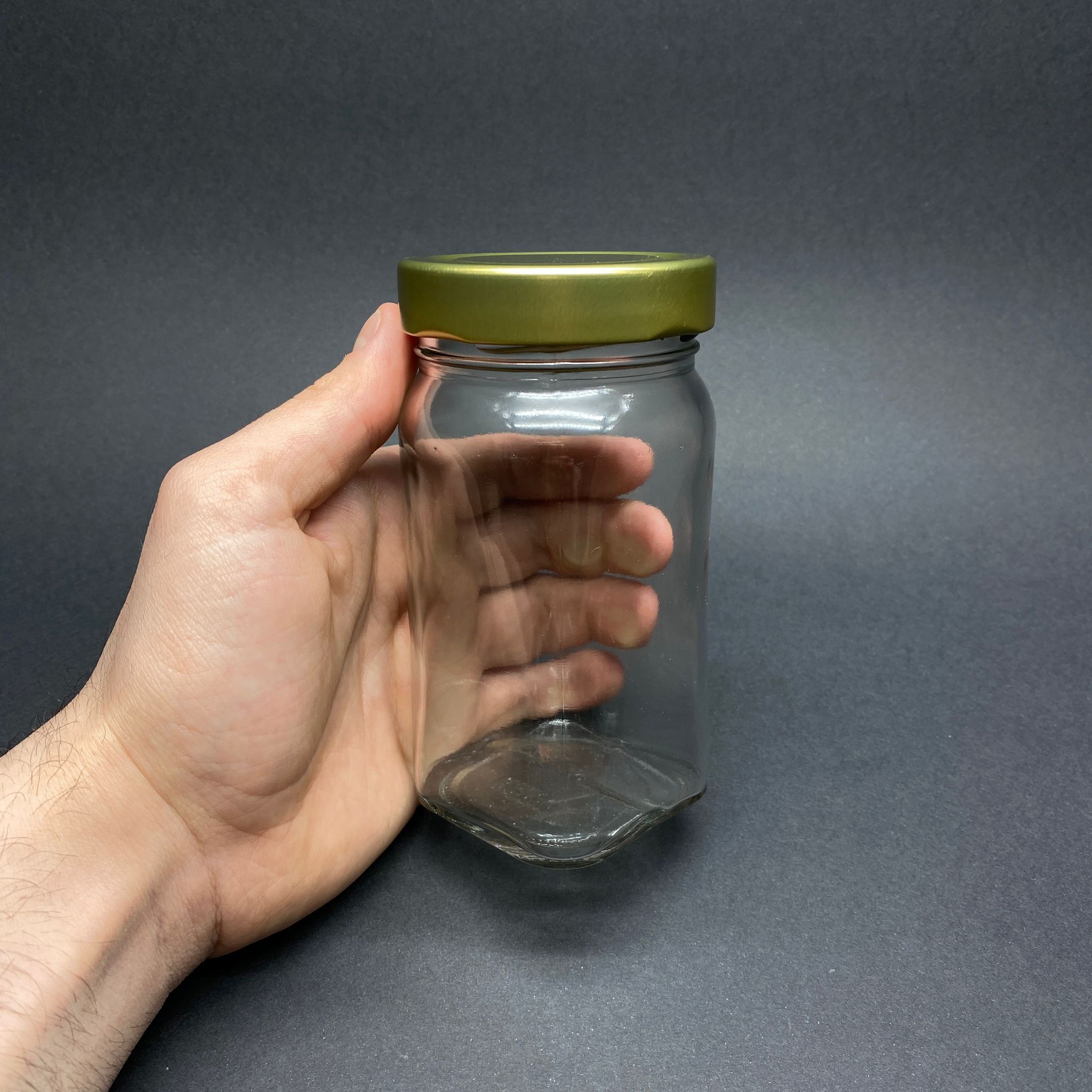 300 CC ALTI KARE ÜSTÜ OVAL CAM KAVANOZ - AĞIZ ÇAPI 63 MM DERİN - GOLD KAPAKLI - 200 adet