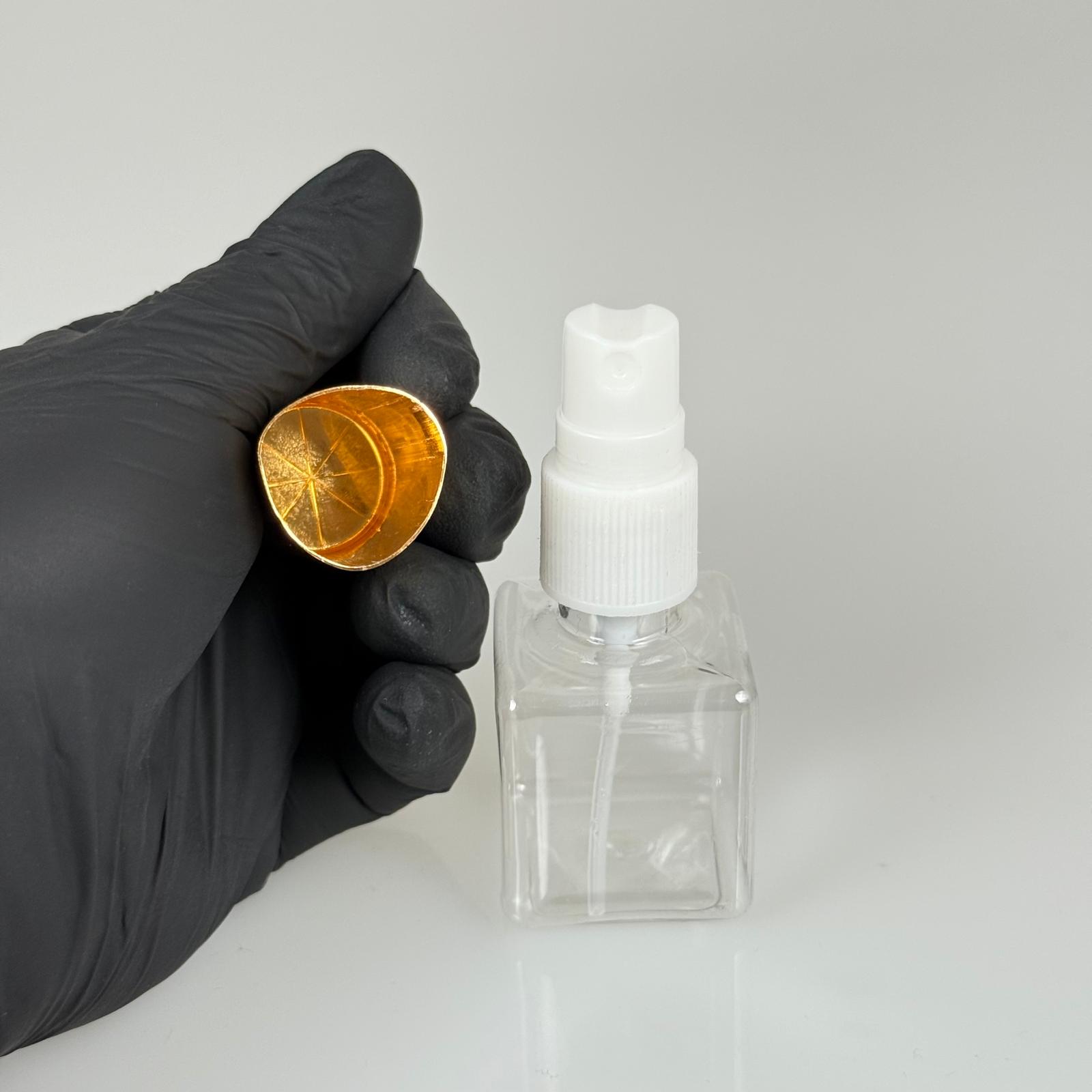 35 ML PET KOLONYA, PARFÜM VB ŞİŞELERİ - METAL ALÜMİNYUM GOLD KAPAK + VİDALI SPREY + 35 CC KARE ŞİŞE SET TAKIM - 1000 adet