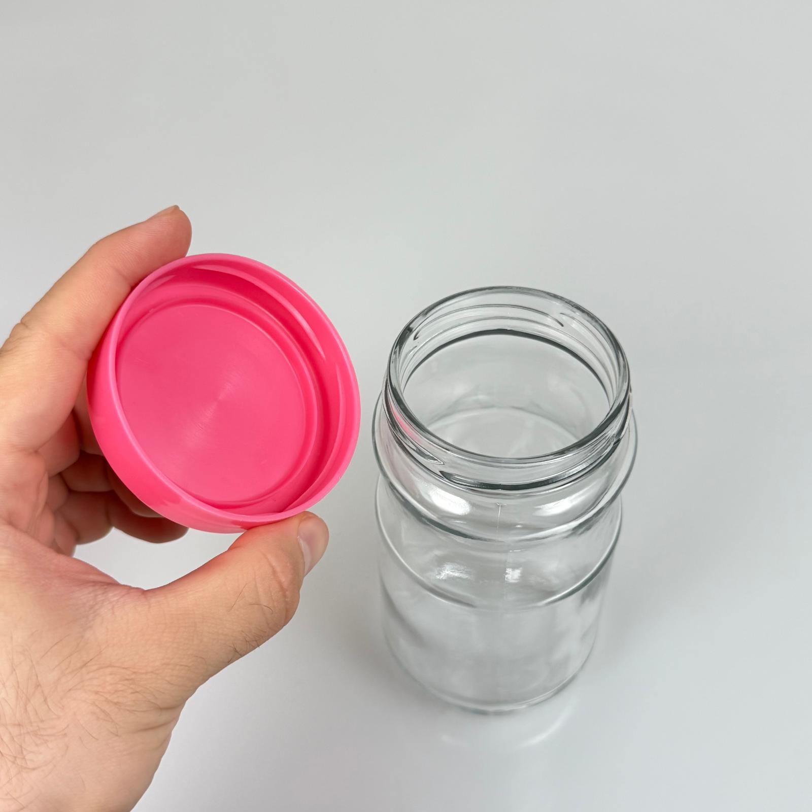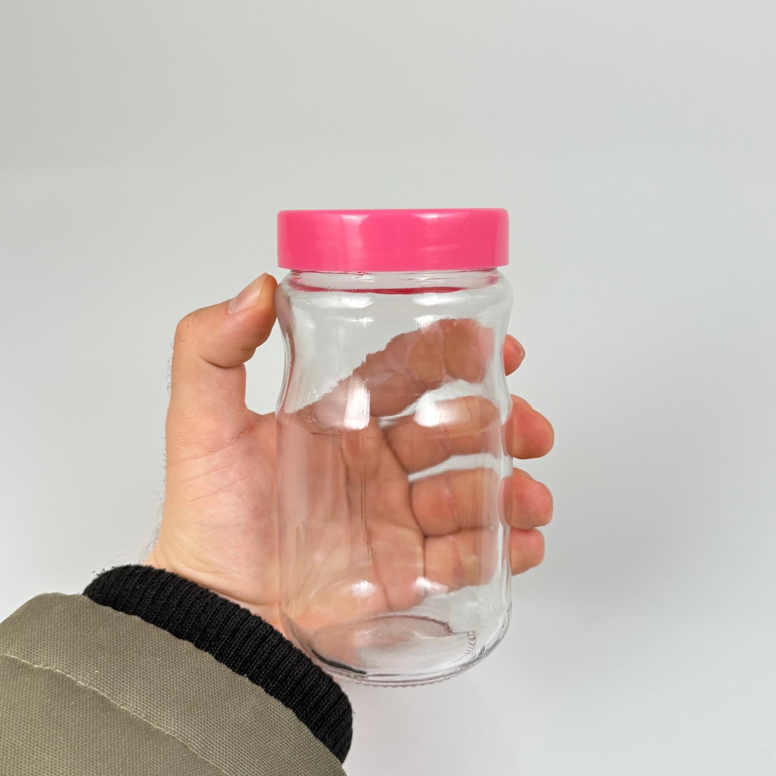 370 CC BOĞUMLU CAM KAVANOZ + PEMBE PLASTİK KAPAK - 370 ML PLASTİK KAPAKLI CAM KAVANOZ - 50 adet