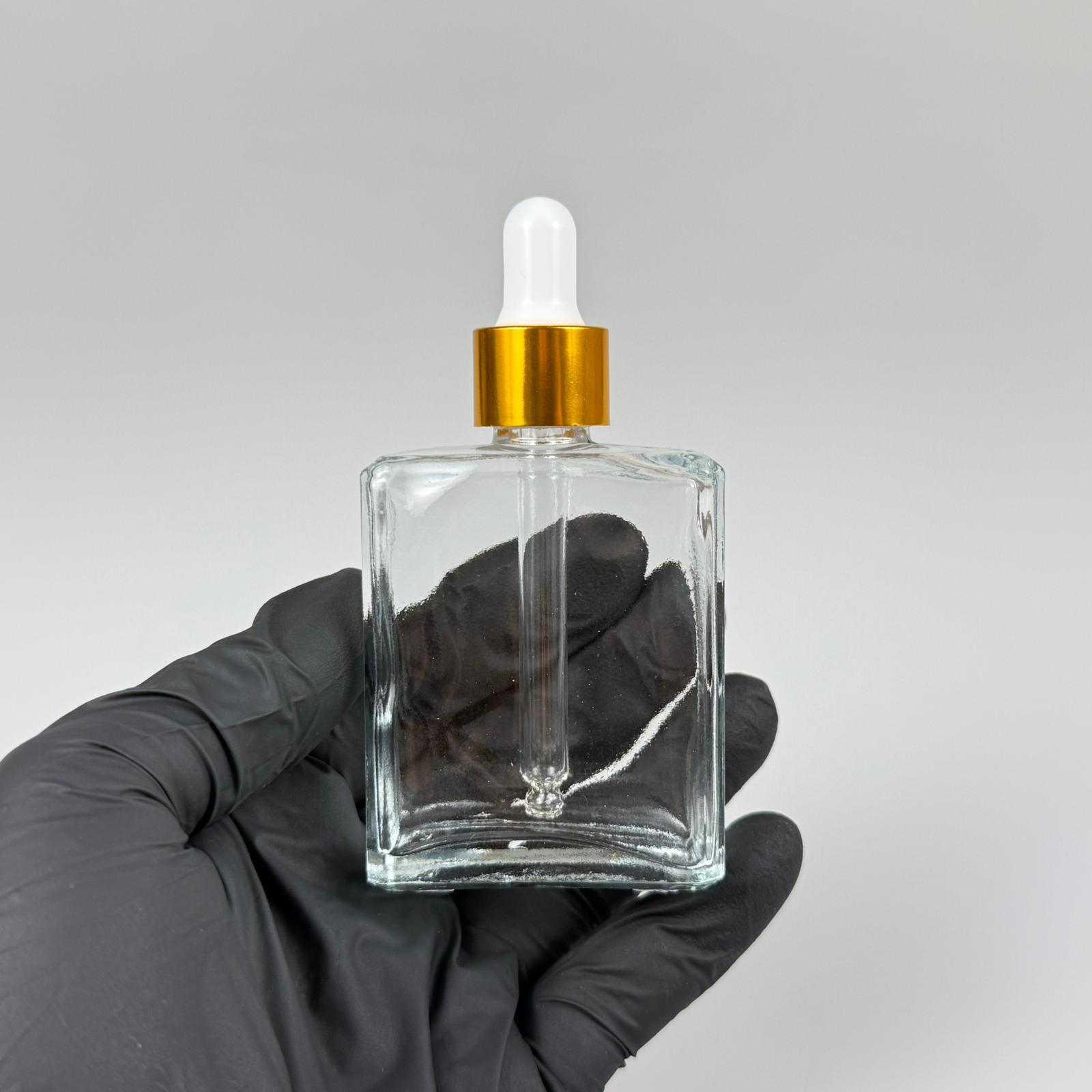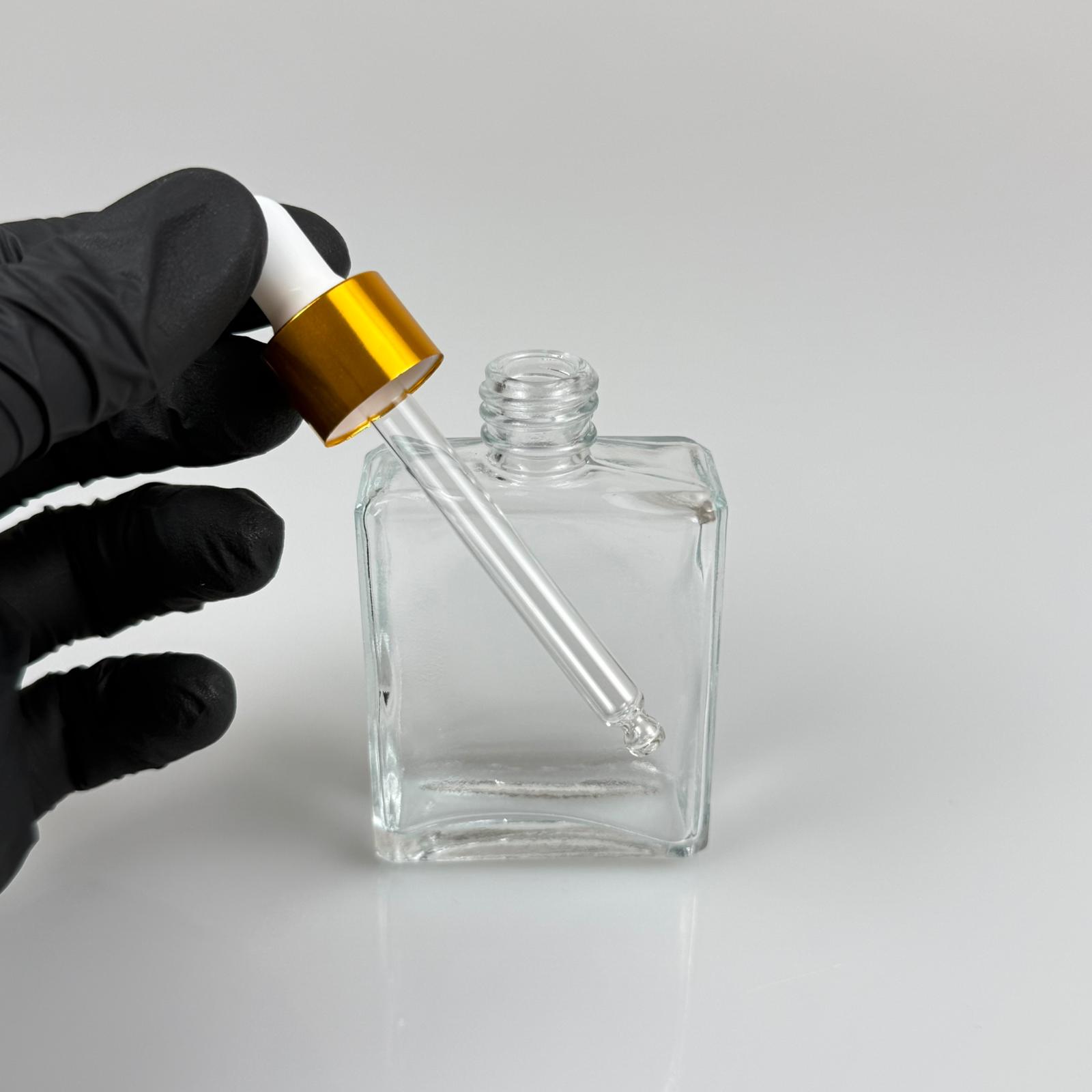 40 CC YASSI DİKDÖRTGEN KÖŞELİ KISA PRESTİJLİ CAM DAMLALIKLI ŞİŞE - BEYAZ EMZİK - GOLD METALİK KAPAK - 40 ML CAM DAMLALIKLI ŞİŞE - DAMLALIKLI BOŞ ŞİŞE - 330 adet