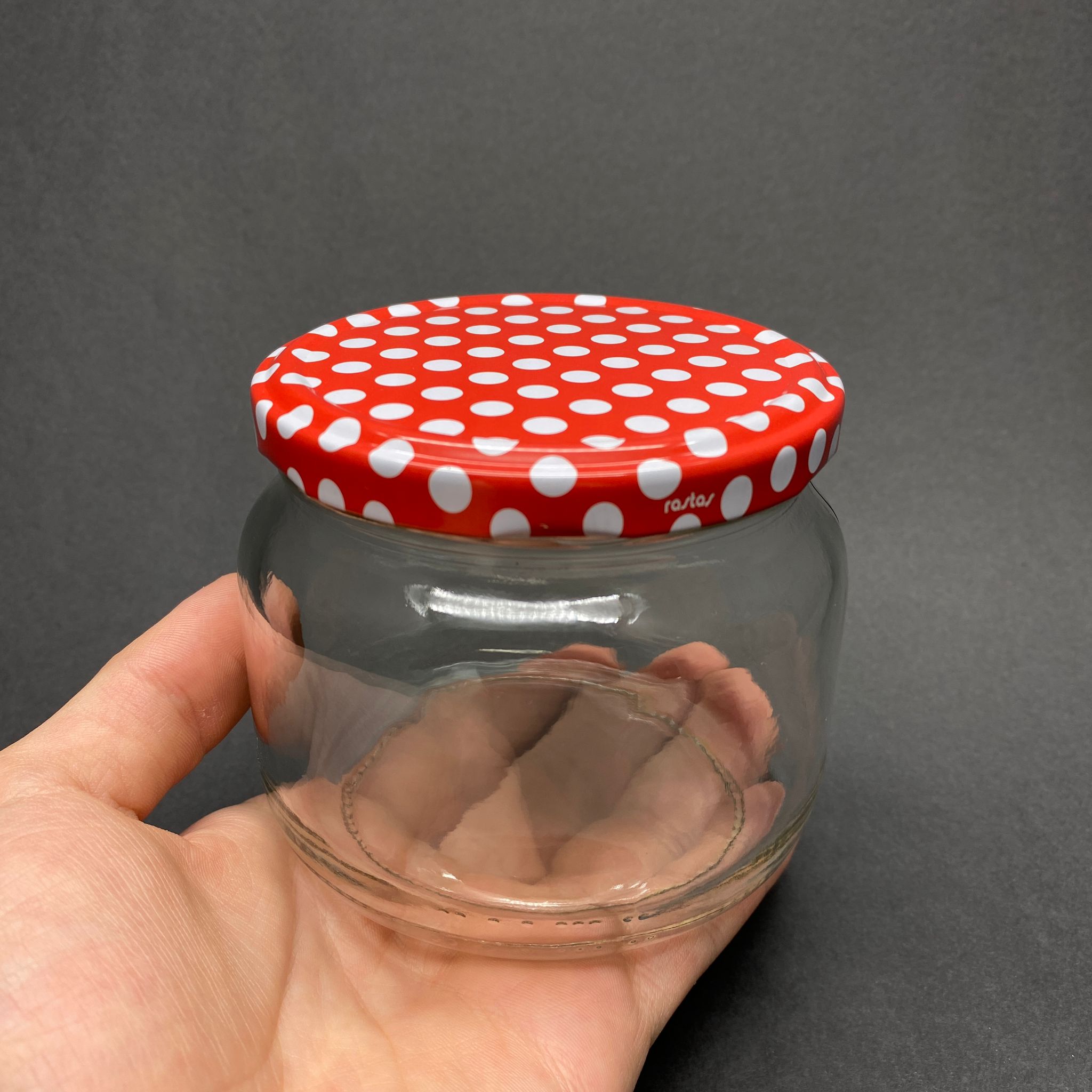 400 CC BASIK CAM KAVANOZ - KIRMIZI PUANTİYE DESENLİ METAL KAPAKLI - 400 ML CAM KAVANOZ - KESTANE ŞEKERİ KAVANOZU - 112 adet