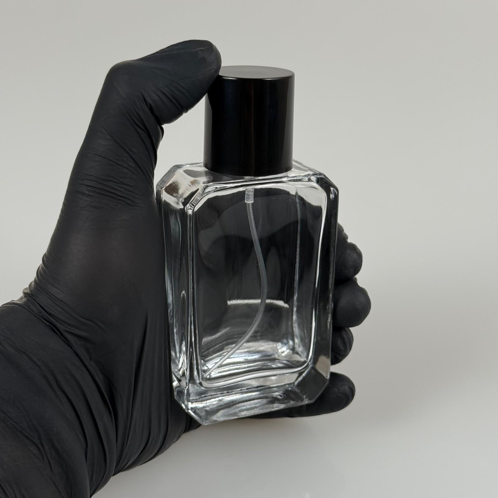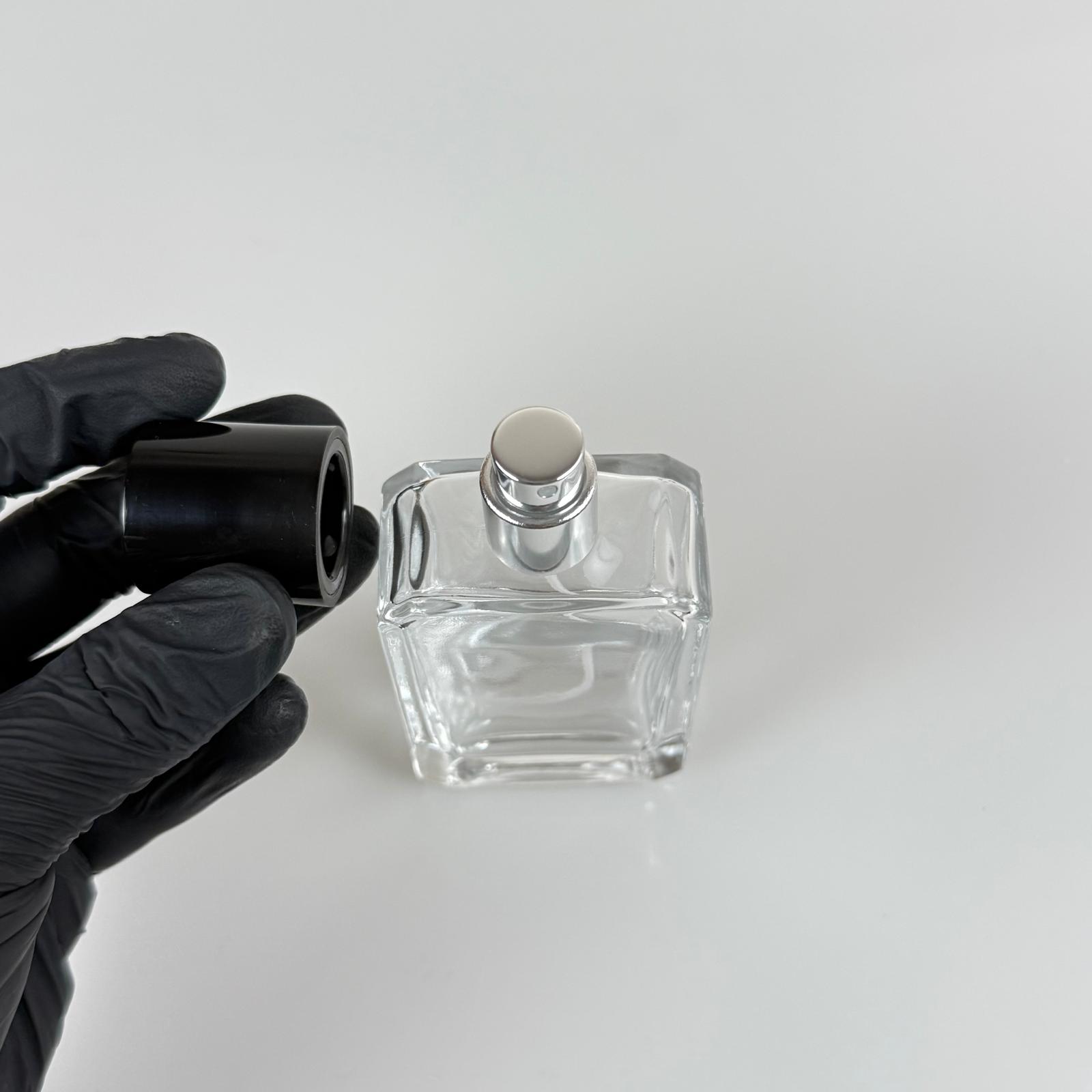 50 ML KÖŞELİ MODEL ANGEL PARFÜM ŞİŞESİ - GÜMÜŞ METAL SPREYLİ + SİYAH KAPAKLI (AĞIZ 15 MM GEÇME KOLAY KAPAMA) - 80 adet