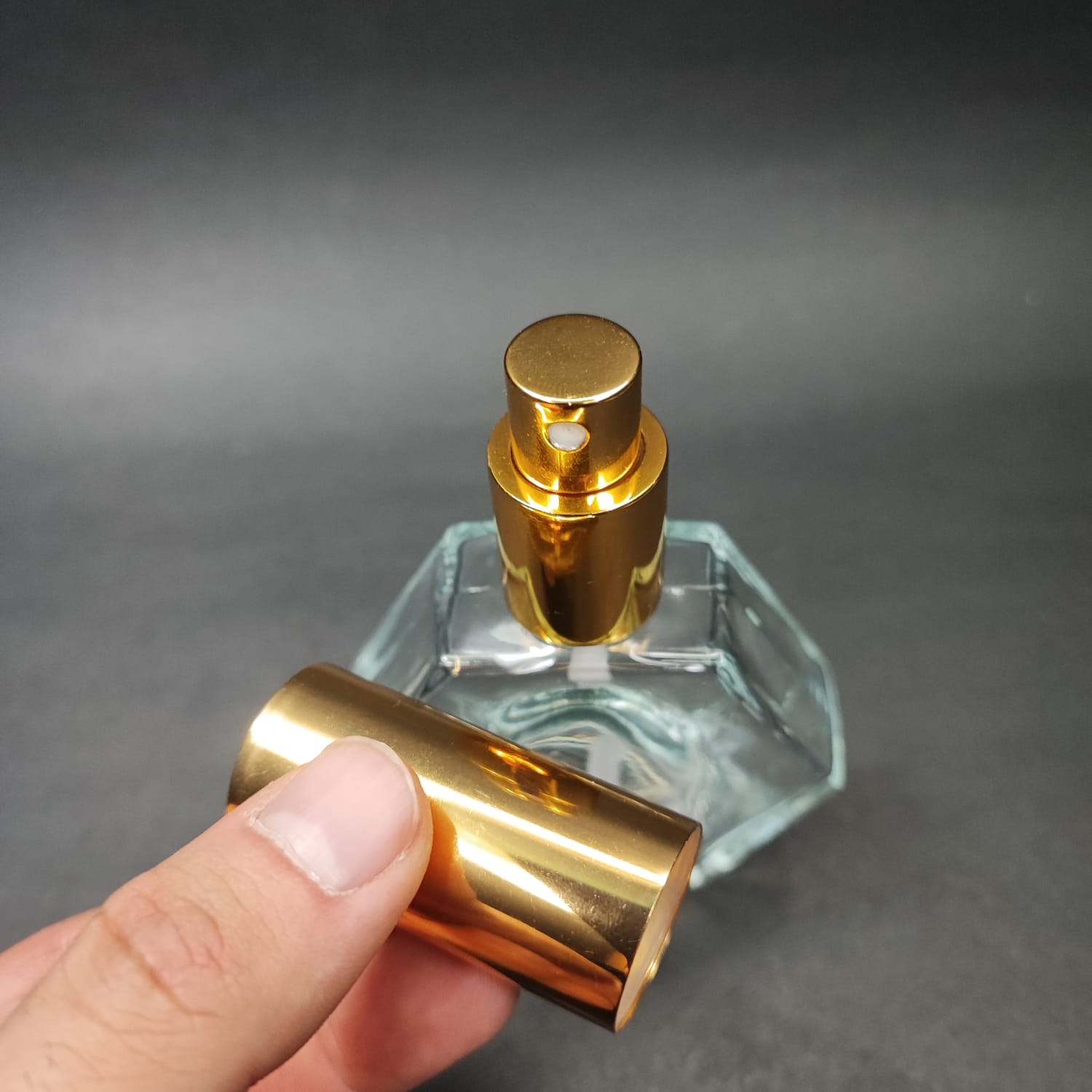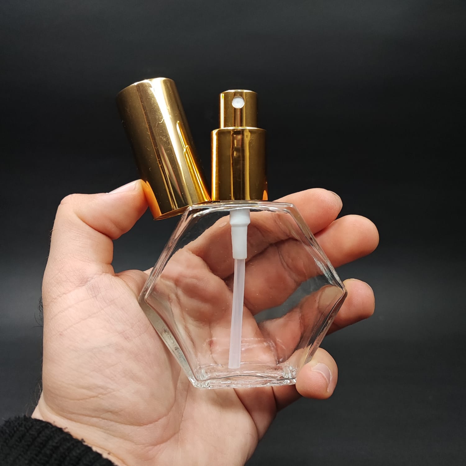 50 ML LÜKS VİDALI VALF ÇEVİRME PARFÜM ŞİŞELERİ - 50 CC ALTIGEN ŞEFFAF CAM ŞİŞE - SİYAH GOLD SPREYLİ KAPAKLI SET - 162 adet