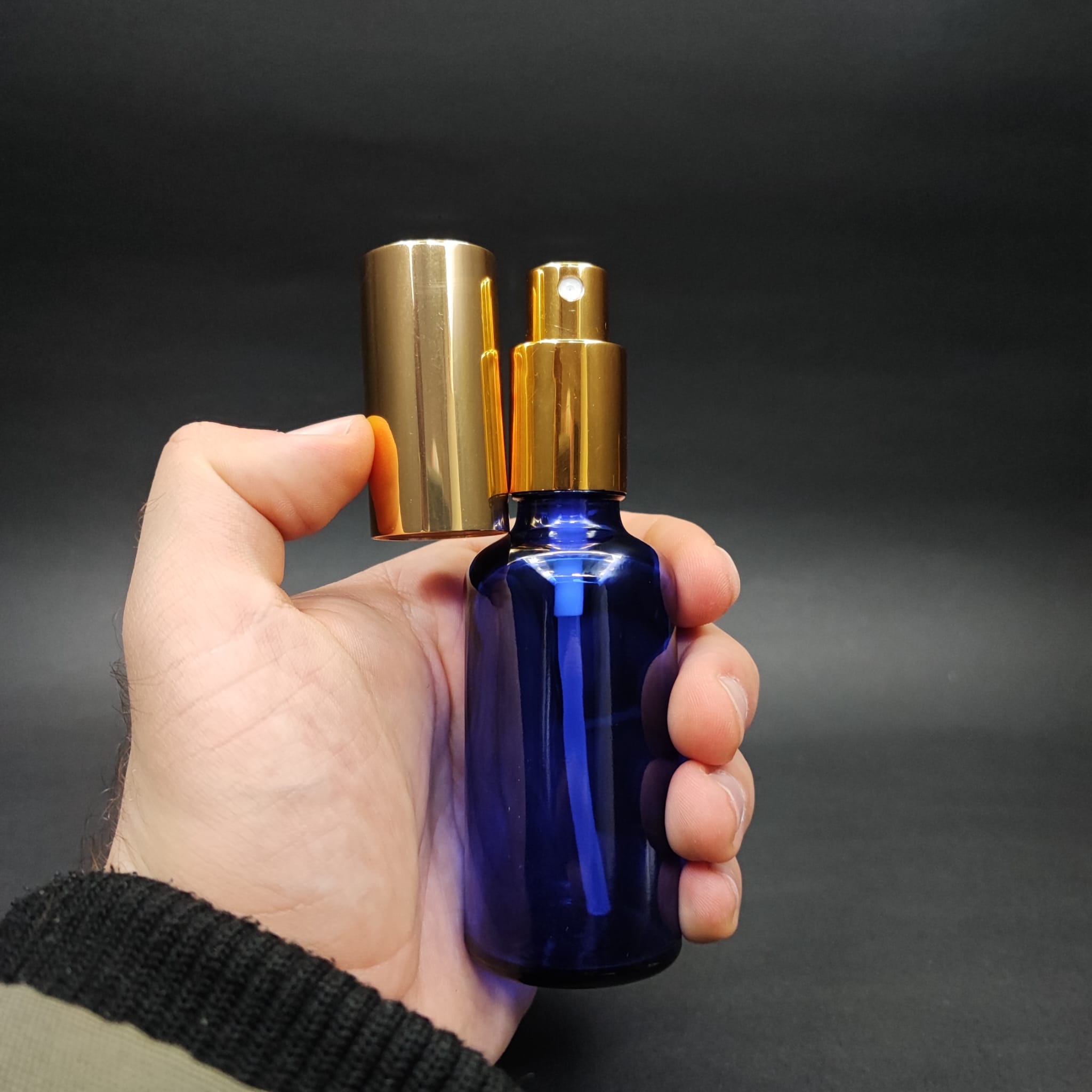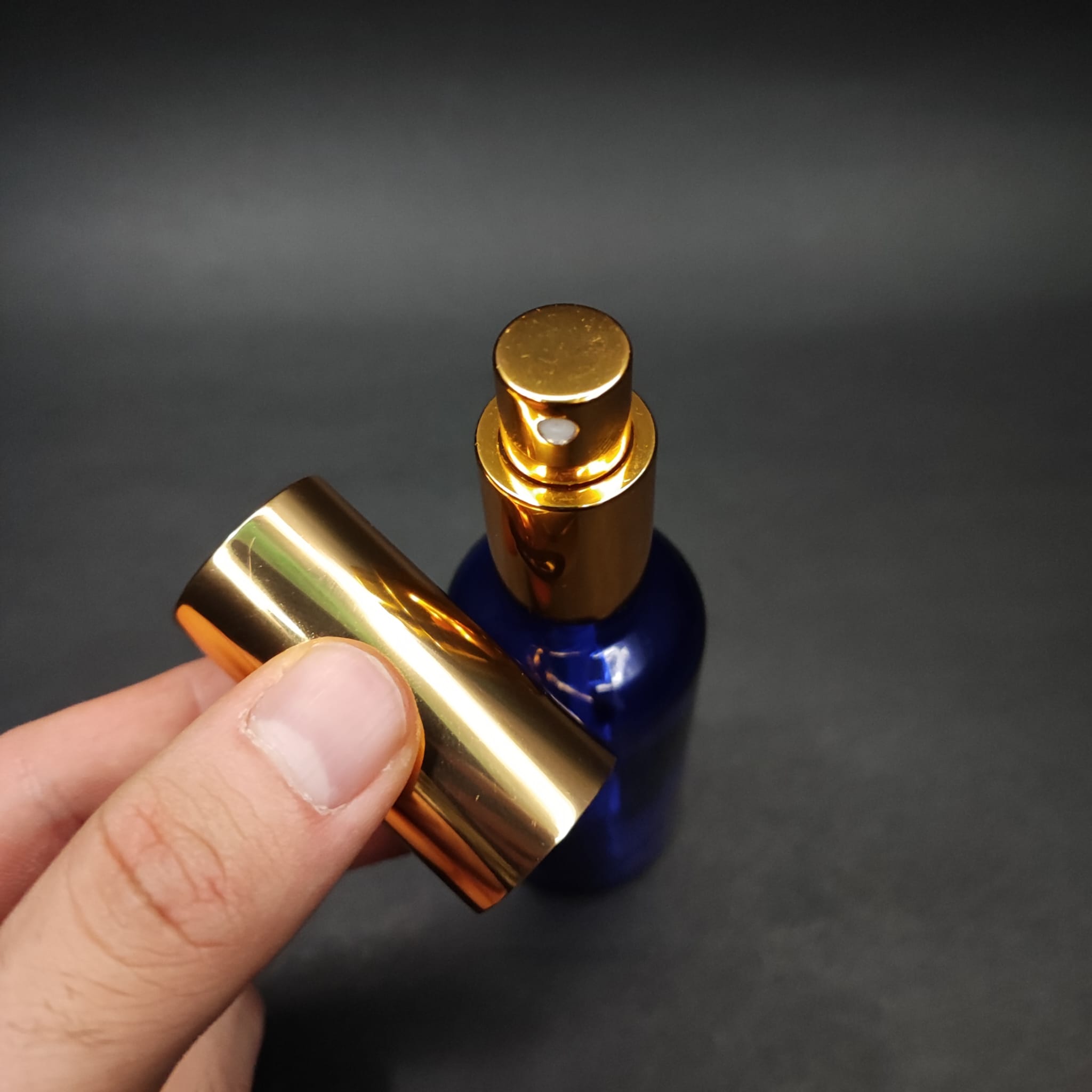 50 ML LÜKS VİDALI VALF ÇEVİRME PARFÜM ŞİŞELERİ - 50 CC MAVİ CAM ŞİŞE - GOLD METAL SPREYLİ KAPAKLI SET - 88 adet