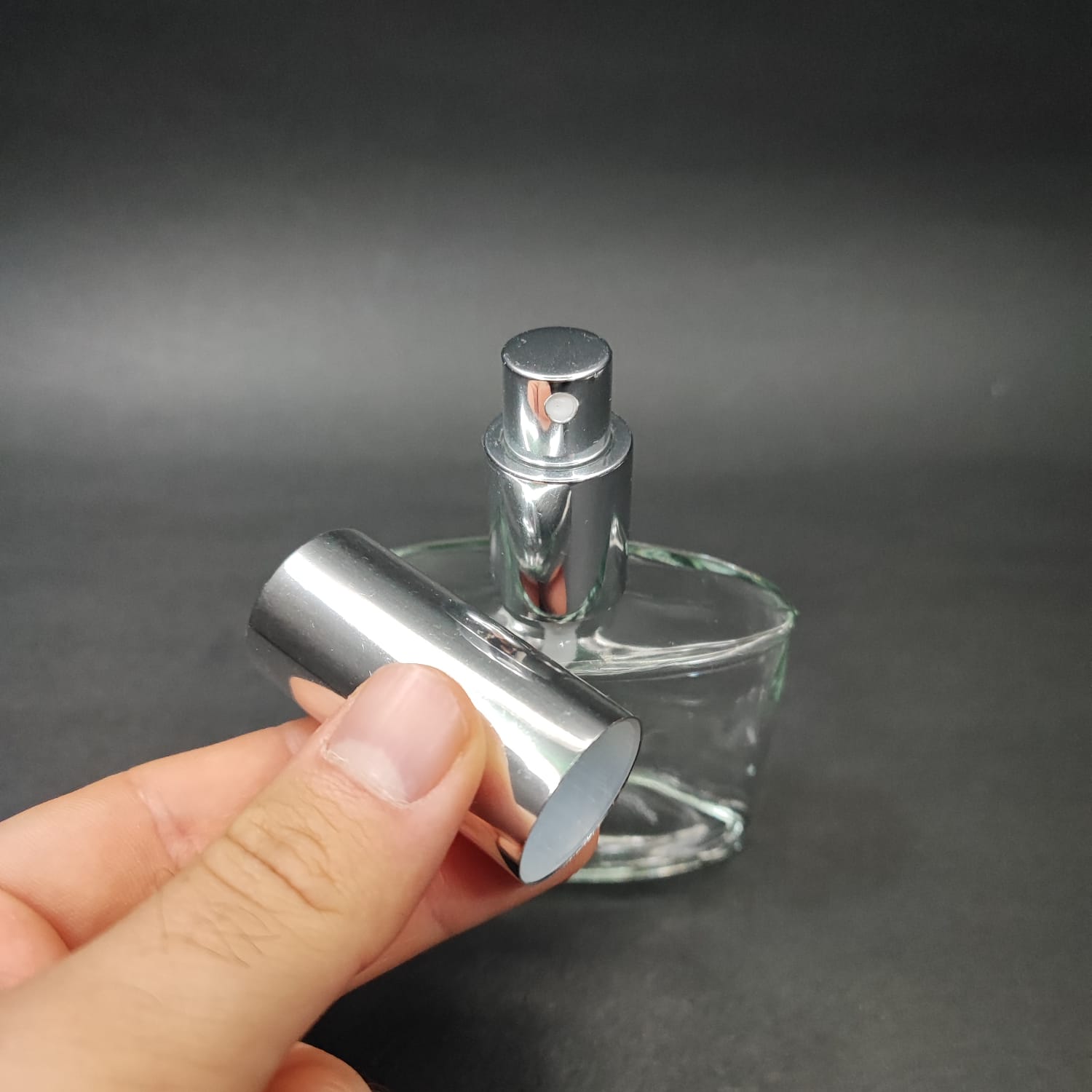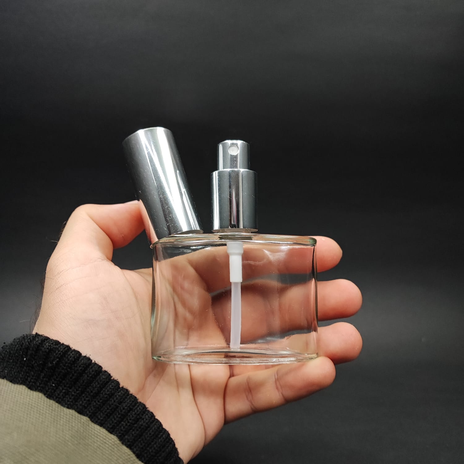 50 ML LÜKS VİDALI VALF ÇEVİRME PARFÜM ŞİŞELERİ - 50 CC YASSI ŞEFFAF CAM ŞİŞE - GÜMÜŞ METAL SPREYLİ KAPAKLI SET - 162 adet