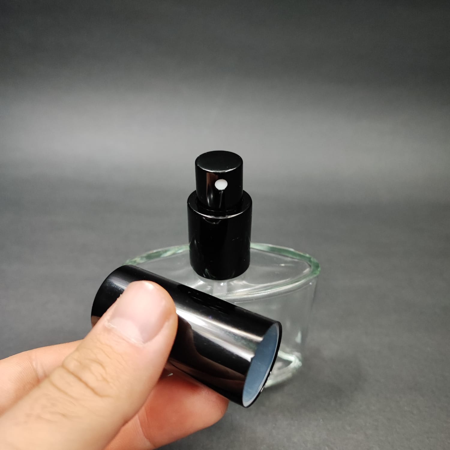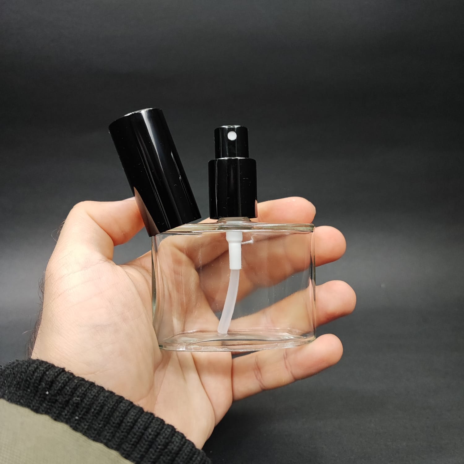 50 ML LÜKS VİDALI VALF ÇEVİRME PARFÜM ŞİŞELERİ - 50 CC YASSI ŞEFFAF CAM ŞİŞE - SİYAH METAL SPREYLİ KAPAKLI SET - 162 adet