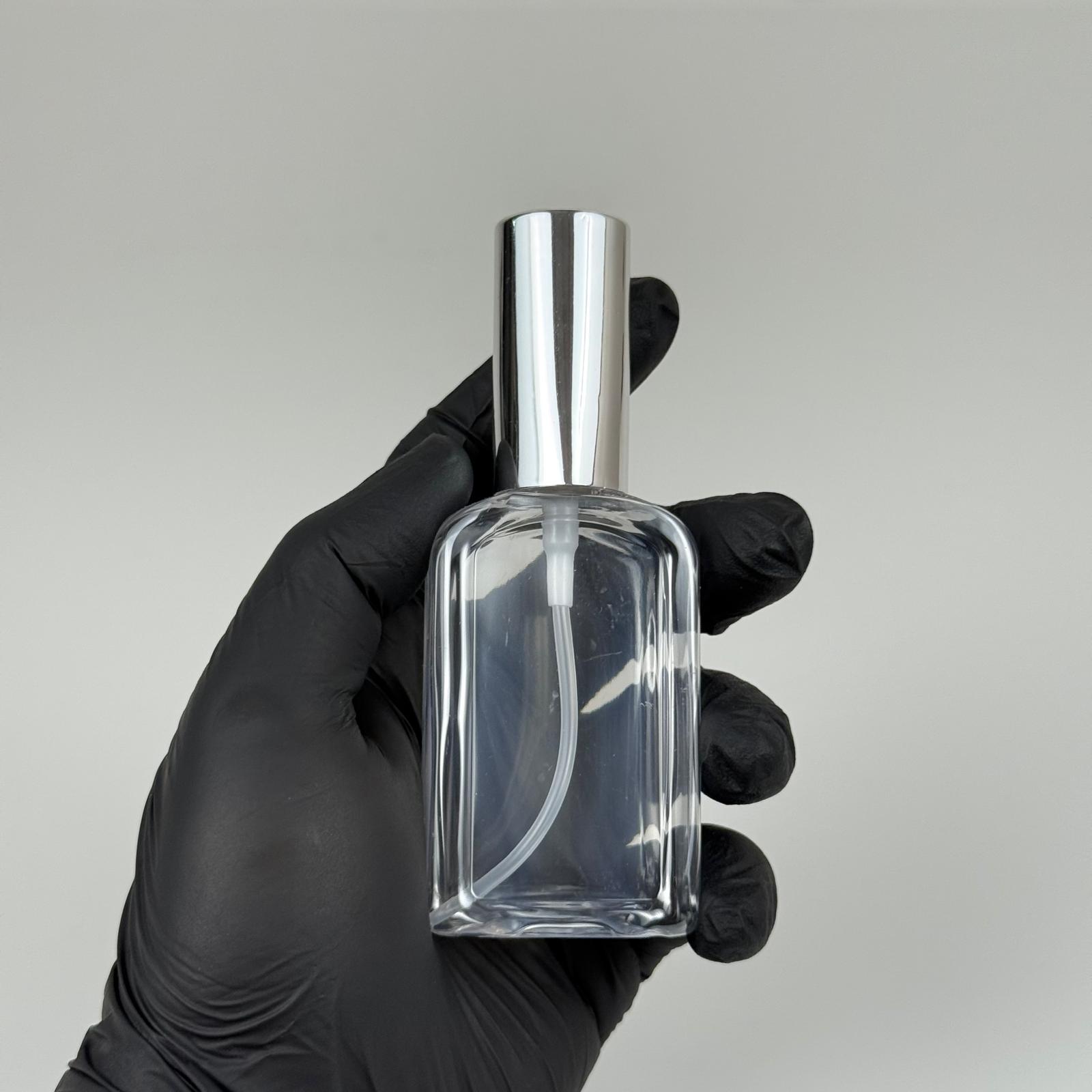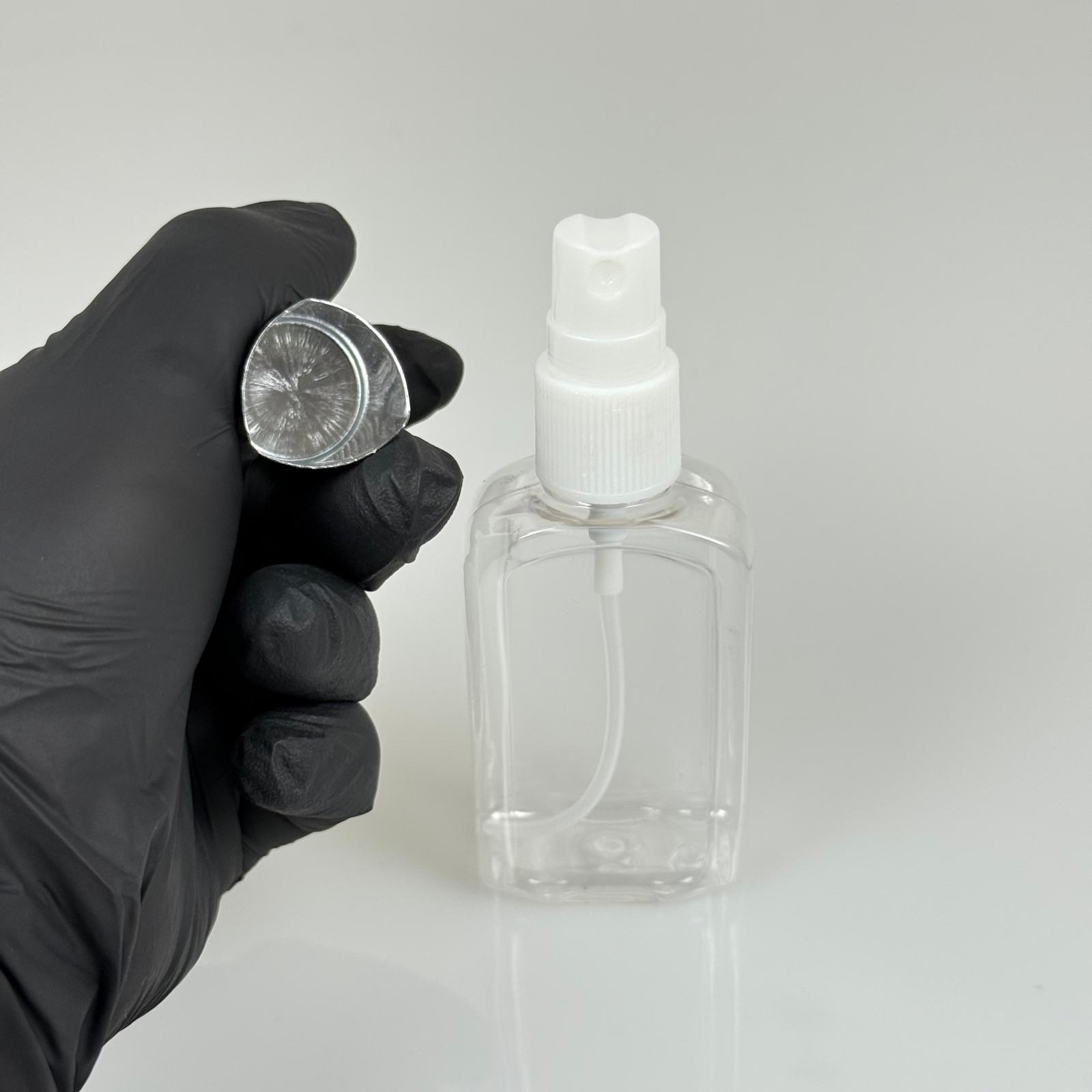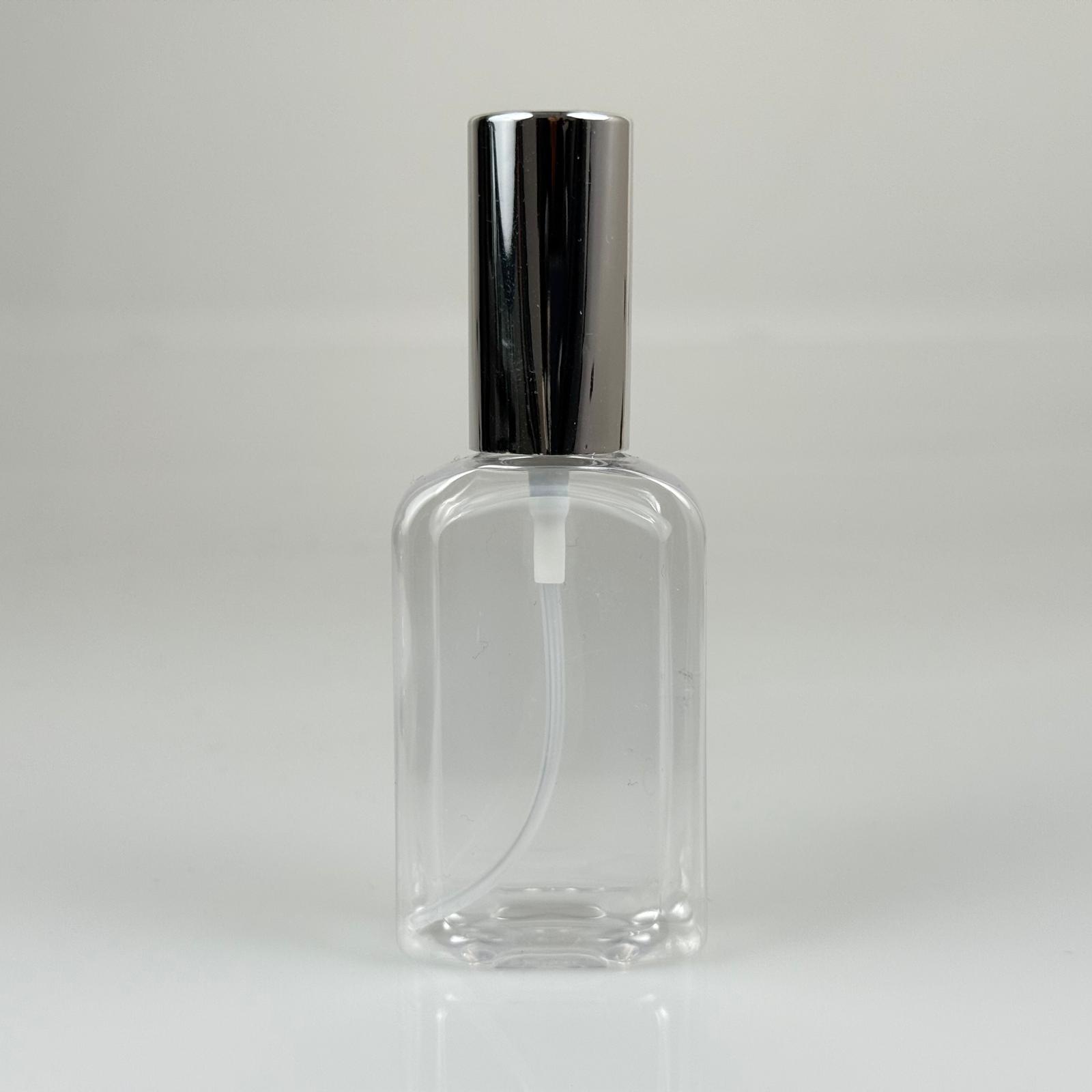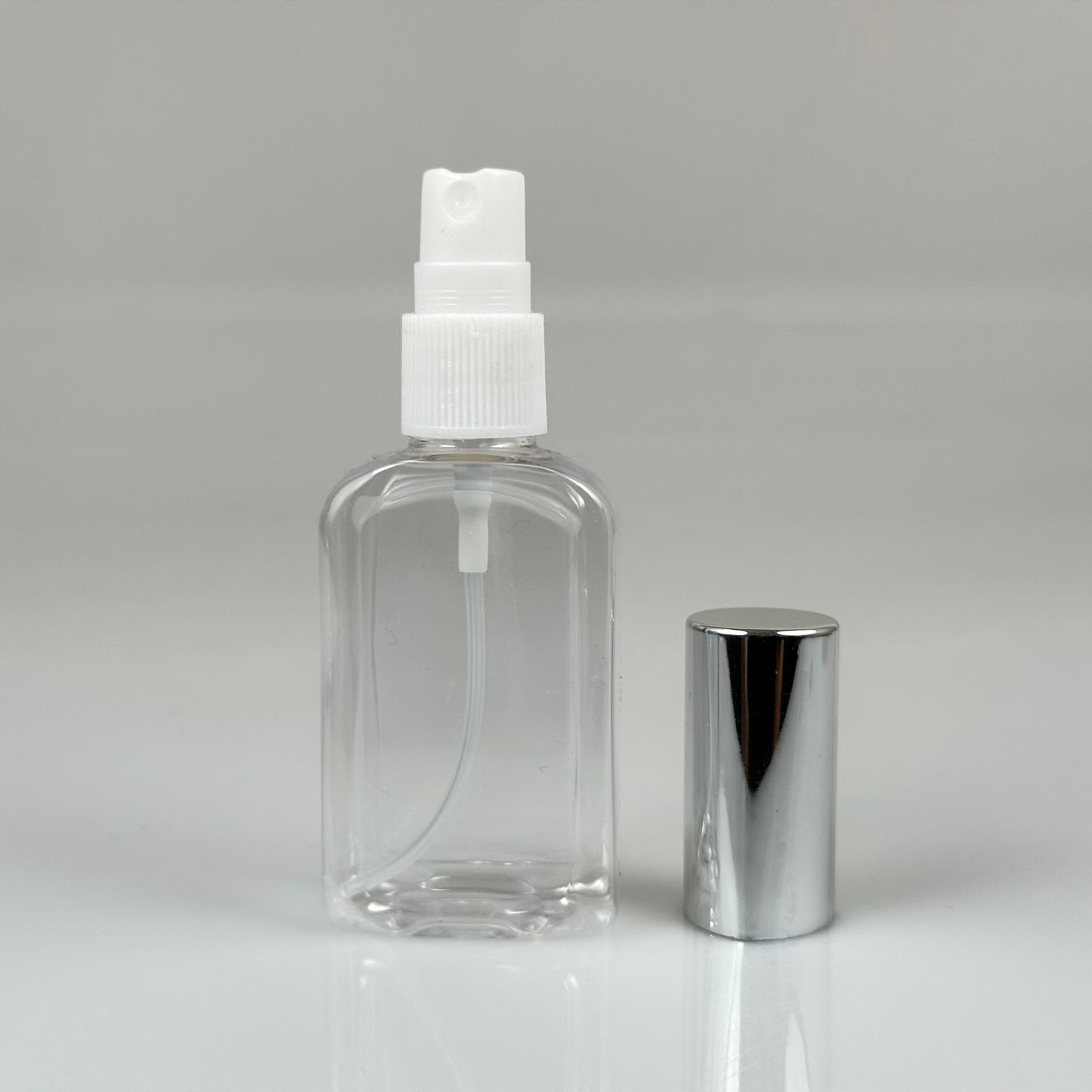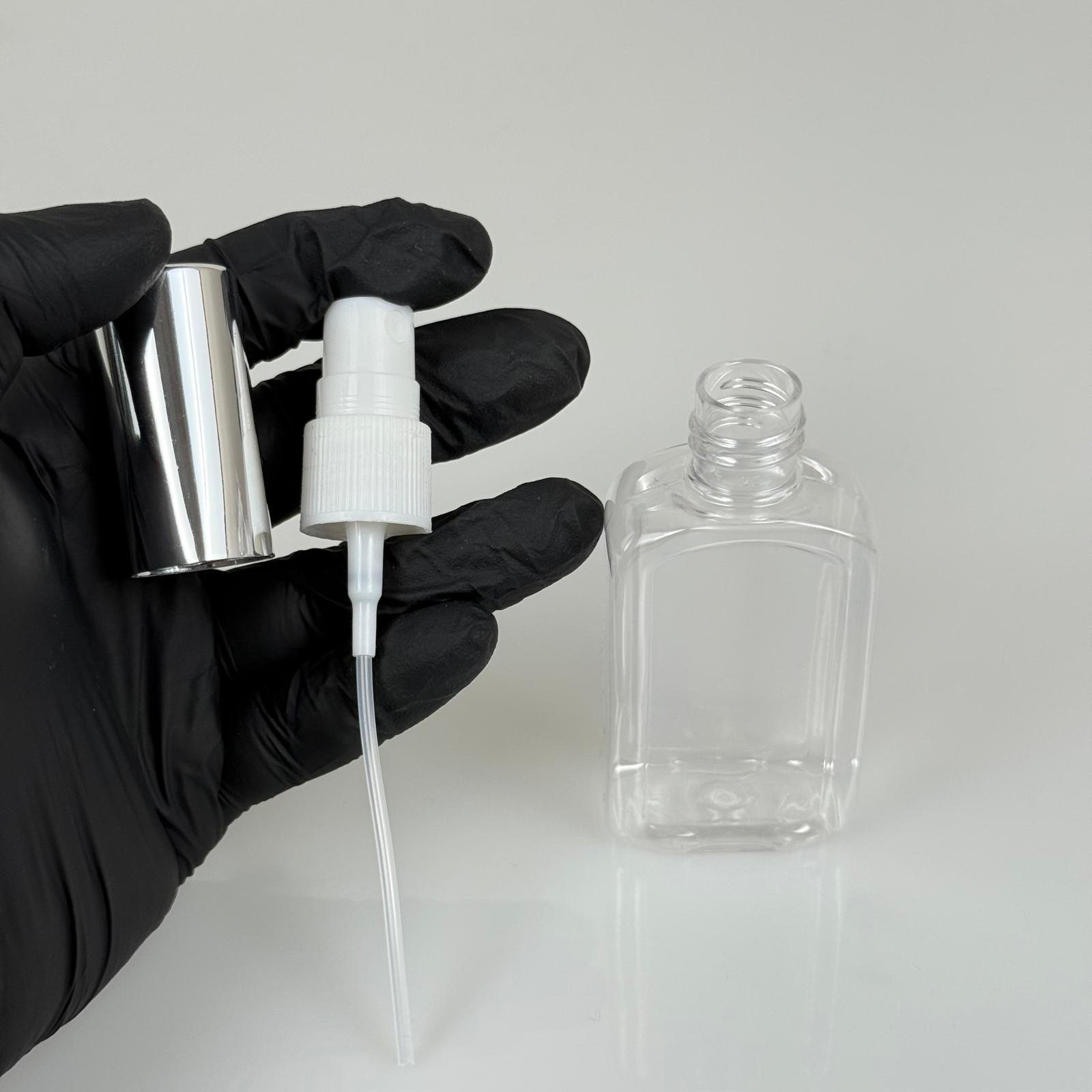 50 ML PET KOLONYA, PARFÜM VB ŞİŞELERİ - METAL ALÜMİNYUM GÜMÜŞ KAPAK + VİDALI SPREY + 50 CC KÖŞELİ YASSI ŞİŞE SET TAKIM - 1000 adet