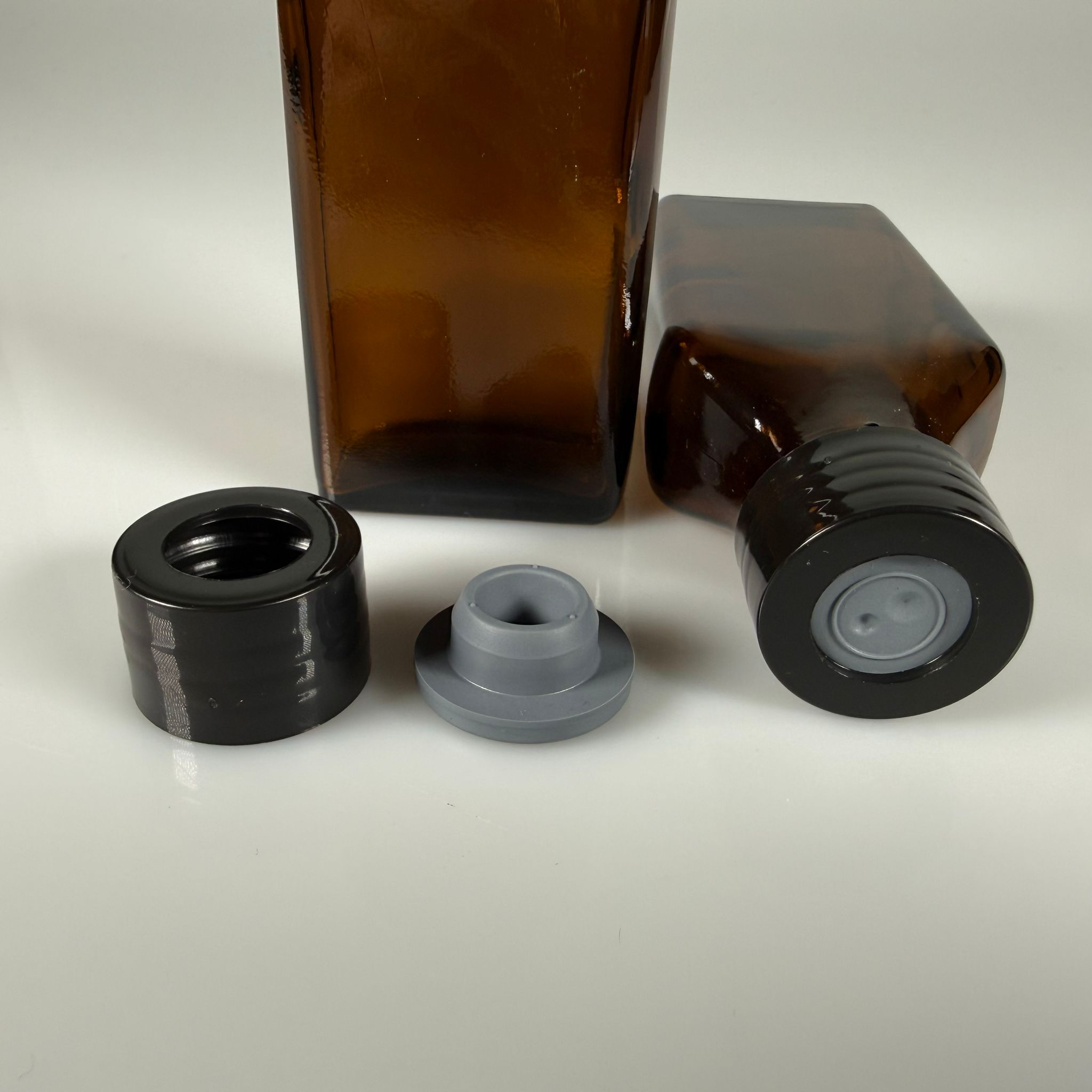 FLAKON ENJEKTÖR SERUM ŞİŞESİ - 100 ML YASSI AMBER ECZA CAM ŞİŞE + VİDALI DELİKLİ KAPAK (ELLE ÇEVİREREK KAPANIR) + KAUÇUK BUTİL TIPA TAKIM - 91 adet