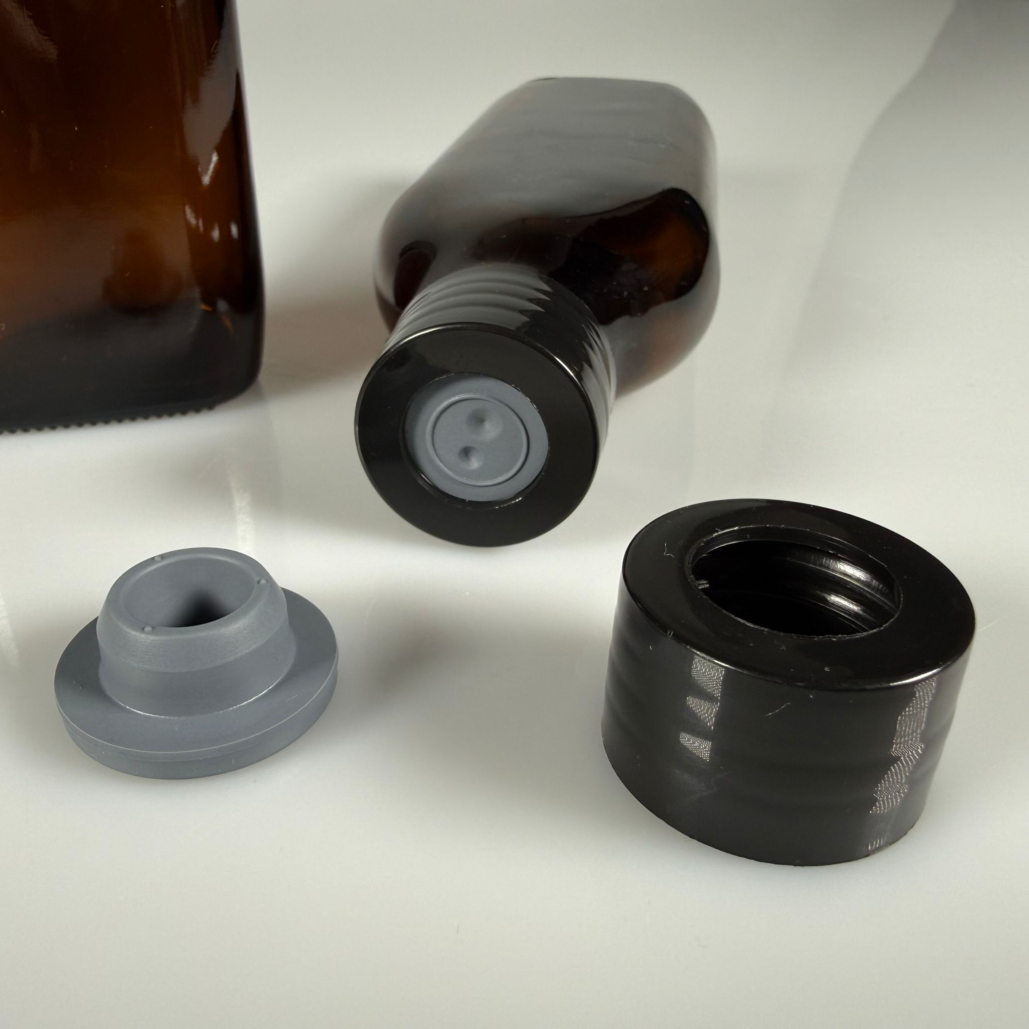 FLAKON ENJEKTÖR SERUM ŞİŞESİ - 150 ML YASSI ECZA CAM ŞİŞE + VİDALI DELİKLİ KAPAK (ELLE ÇEVİREREK KAPANIR) + KAUÇUK BUTİL TIPA TAKIM - 64 adet