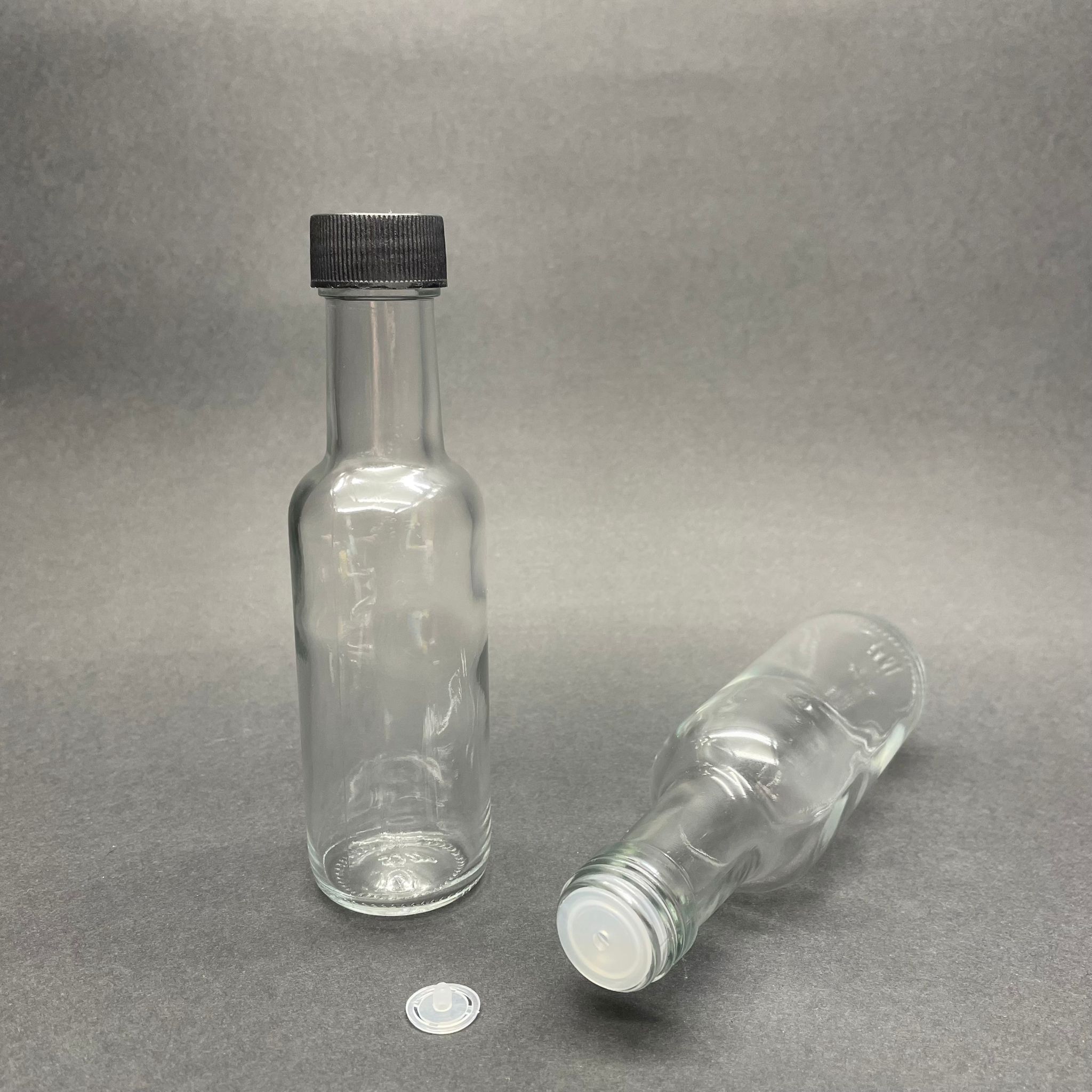 100 CC DORİKA CAM ŞİŞE - SİYAH CONTALI KAPAKLI + TIPALI (AĞIZ ÇAPI 25 MM) - 100 ML ŞEFFAF CAM DORİKA ŞİŞE - 108 adet