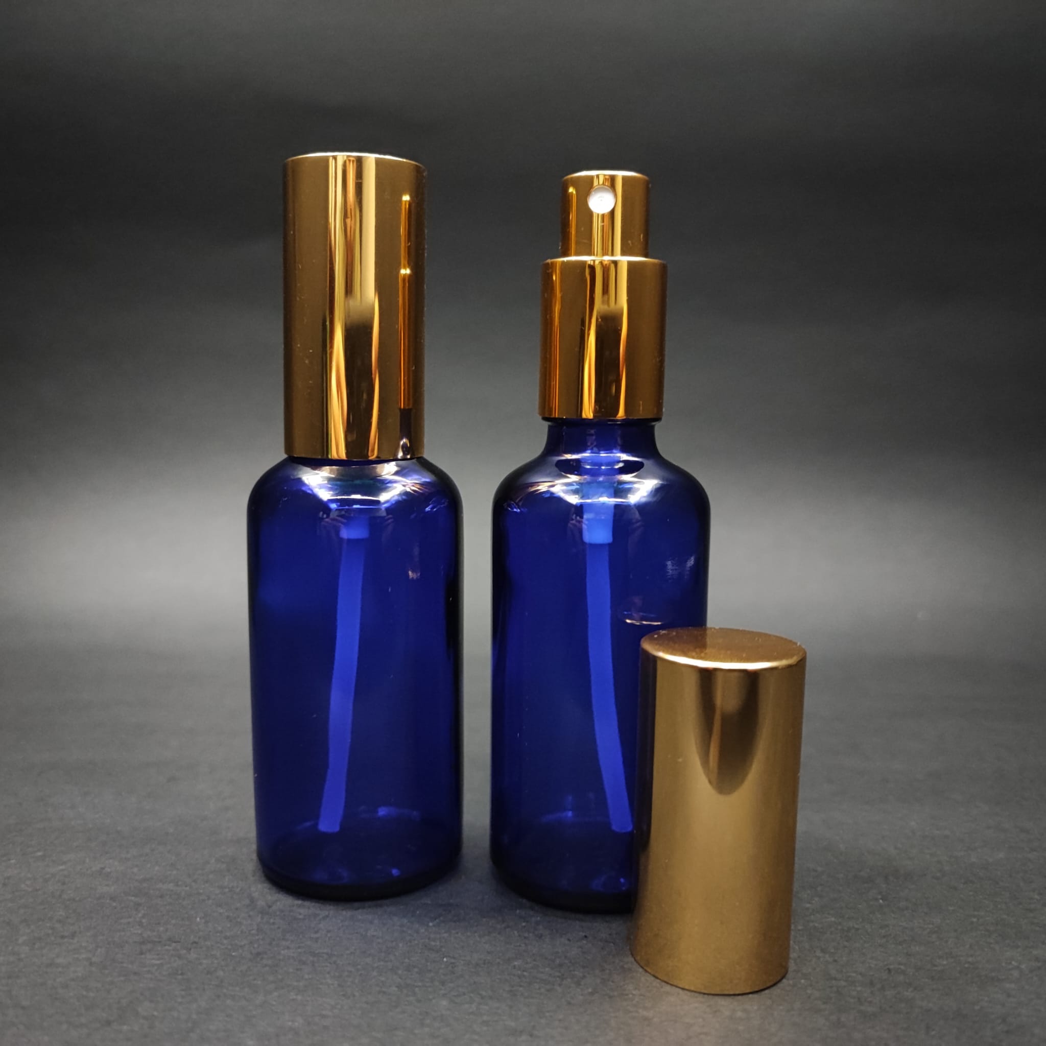 50 ML LÜKS VİDALI VALF ÇEVİRME PARFÜM ŞİŞELERİ - 50 CC MAVİ CAM ŞİŞE - GOLD METAL SPREYLİ KAPAKLI SET - 88 adet